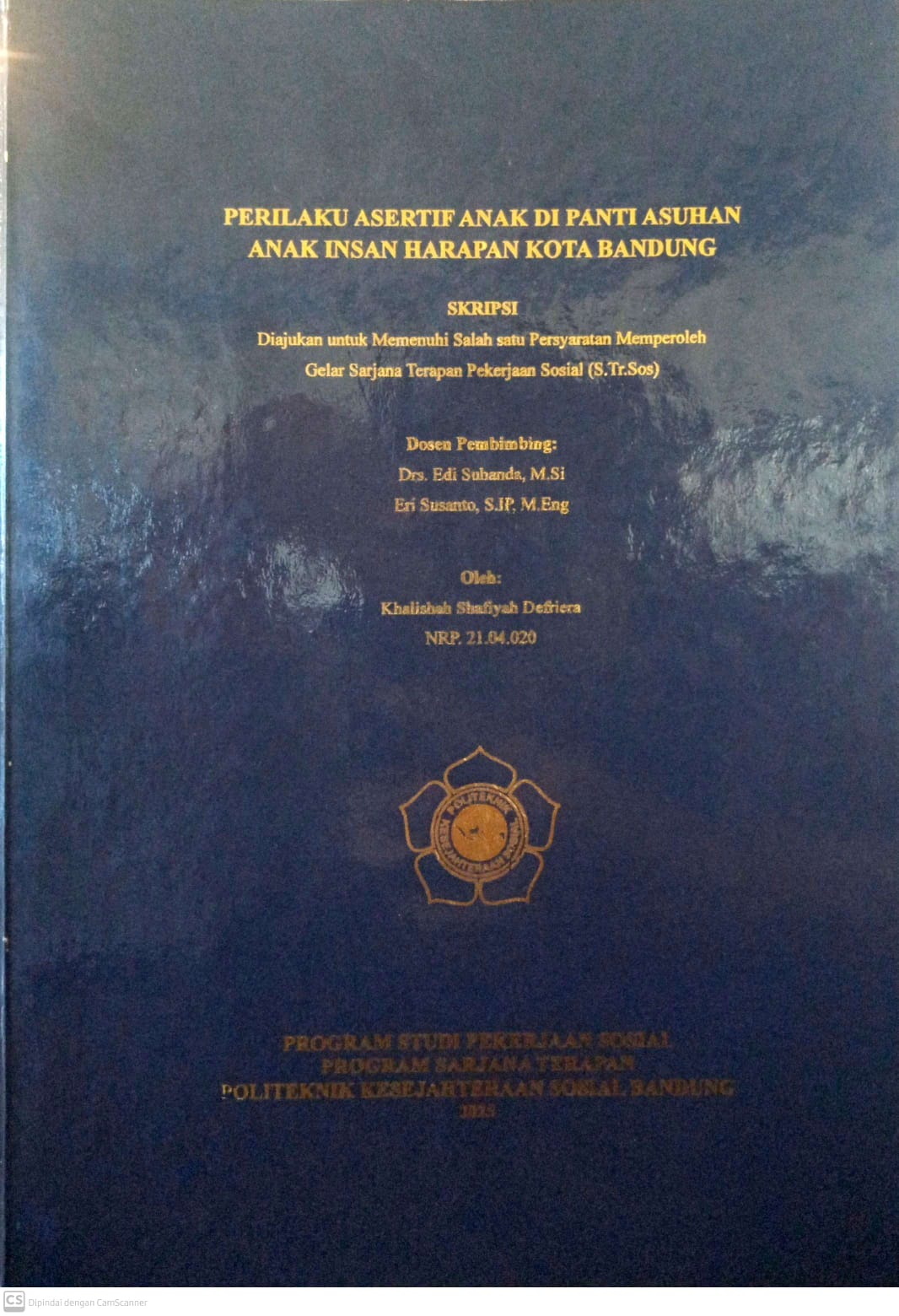 Khalishah Shafiyah Defriera, NRP. 21.04.020. Perilaku Asertif Anak di Panti Asuhan Anak Insan Harapan Kota Bandung. Dibimbing oleh EDI SUHANDA dan ERI SUSANTO Perilaku asertif merupakan kemampuan individu untuk mengekspresikan pikiran, perasaan, dan kebutuhan secara jujur, tegas, serta tetap menghormati orang lain. Penelitian ini bertujuan untuk memperoleh gambaran empiris mengenai: 1) karakteristik responden, 2) perilaku asertif aspek permintaan, 3) penolakan, 4) pengekspresian diri, 5) pujian, dan 6) berperan dalam pembicaraan. Metode yang digunakan dalam penelitian ini adalah metode kuantitatif dengan pendekatan deskriptif. Teknik pengumpulan data dilakukan melalui kuesioner dan studi dokumentasi. Instrumen penelitian menggunakan skala rating (rating scale). Uji validitas dilakukan dengan validitas muka (face validity), dan uji reliabilitas menggunakan Cronbach’s Alpha dengan hasil 0,947 > 0,600 (sangat reliabel). Hasil penelitian menunjukkan bahwa perilaku asertif anak berada pada kategori sedang, dengan 73,59%. Aspek permintaan dengan 77,99% dan pujian dengan 80,20% masuk pada kategori tinggi sedangkan aspek penolakan dengan 70,44%, aspek pengekspresian diri dengan 71,74% dan berperan dalam pembicaraan dengan 67,57% masuk ke dalam kategori sedang. Program yang diusulkan adalah “Meningkatkan Kemampuan Perilaku Asertif melalui SAHABAT (Sikap Asertif Hebat Anak Panti) di Panti Asuhan Anak Insan Harapan Kota Bandung” dengan tujuan Meningkatkan kemampuan anak dalam mengatakan “tidak” secara tegas namun tetap sopan saat menghadapi ajakan atau tekanan yang tidak sesuai dengan nilai atau keinginannya sendiri, meningkatkan keberanian anak untuk mengungkapkan pendapat dan perasaan pribadi secara terbuka di lingkungan sosial dan meningkatkan partisipasi aktif anak dalam komunikasi dua arah agar mereka lebih berani memulai percakapan dan memberikan tanggapan dengan percaya diri. Kata Kunci: Perilaku Asertif, Anak, Panti Asuhan