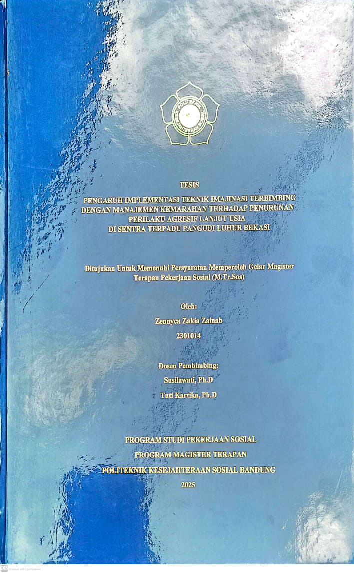 Zennyca Zakia Zainab. 23.01.014. Pengaruh Implementasi Teknik Imajinasi Terbimbing dengan Manajemen Kemarahan Terhadap Penurunan Perilaku Agresif Lanjut Usia di Sentra Terpadu Pangudi Luhur Bekasi. Politeknik Kesejahteraan Sosial Bandung. Dosen Pembimbing: Susilawati dan Tuti Kartika Perilaku agresif menjadi isu penting yang dialami oleh lanjut usia (lansia) dengan berbagai faktor dan latar belakang yang dialaminya. Terdapat beberapa penelitian sebelumnya yang meneliti terkait perilaku agresif lansia baik di lembaga maupun dimasyarakat. Teknik imajinasi terbimbing menjadi salah satu teknik yang dilakukan lembaga atau instansi dalam menangani perilaku agresif. Namun pada faktanya teknik ini belum optimal dan memiliki kelemahan dalam menangani perilaku agresif. Penanganan perilaku agresif menjadi isu penting untuk meningkatkan kesejahteraan psikososial bagi lansia. Desain teknik imajinasi terbimbing dengan manajemen kemarahan telah dirancang untuk merespon isu tersebut untuk mengatasi kelemahan teknologi dari sebelumnya. Penelitian ini bertujuan untuk menguji teknik imajinasi terbimbing dengan manajemen kemarahan dengan mengintegrasikan langkah dari kedua teknik tersebut yang bertujuan untuk menurunkan perilaku agresif lansia. Metode penelitian menggunakan Single Subject Design (SSD) terhadap tiga subjek dengan menggunakan desain reversal A-B-A. Alat pengumpulan data menggunakan observasi dengan target perilaku yaitu serangan fisik, berkata kasar, dan mengancam. Dilengkapi dengan Buss–Perry Aggression Questionnaire (BPAQ), wawancara dan studi dokumentasi. Uji validitas menggunakan validitas antar muka, sedangkan uji reabilitas menggunakan percent agreement. Analisis data menggunakan analisis dalam dan antar kondisi. Hasil penelitian menunjukkan penerapan teknik ini terbukti efektif dalam menurunkan perilaku agresif, hal tersebut terlihat dari segi penurunan pada fase baseline A2. Hasil tersebut diperkuat dengan pengakuan dari pekerja sosial yang telah mengamati perilaku agresif pada sebelum dan sesudah intervensi ini diberikan. Meskipun demikian, teknik ini perlu metode eksperimen yang melibatkan lebih banyak subjek, sehingga dari teknik ini dapat digeneralisasikan. Kata Kunci: Kesejahteraan Lansia, Perilaku Agresif, Imajinasi Terbimbing dengan Manajemen Kemarahan