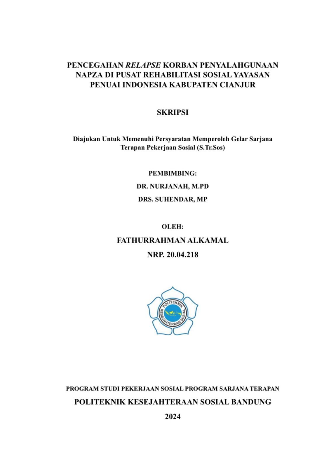 FATHURRAHMAN ALKAMAL, NRP. 20.04.218. Pencegahan Relapse Korban Penyalahgunaan NAPZA di Pusat Rehabilitasi Sosial Yayasan Penuai Indonesia Kabupaten Cianjur, Dosen Pembimbing: NURJANAH dan SUHENDAR Pencegahan relapse adalah kegiatan atau faktor yang (sebaiknya) dilakukan untuk mencegah timbulnya penggunaan zat atau mengurangi dan menstabilkan kondisi seseorang yang sedang menggunakan zat. Penelitian ini bertujuan untuk memperoleh gambaran secara empiris mengenai: 1) Karakteristik informan, 2) Perilaku sehat, 3) Pengambilan keputusan, 4) Peran lingkungan. Penelitian ini menggunakan pendekatan kualitatif dengan metode deskriptif. Penentuan informan yang dilakukan dalam penelitian ini menggunakan teknik purposive dengan jumlah informan sebanyak 5 orang yang terdiri dari 3 informan utama yaitu korban penyalahgunaan NAPZA dan 2 informan pendukung. Teknik pengumpulan data yang digunakan dalam penelitian ini adalah wawancara mendalam (in-depth interview), observasi (observation), dan studi dokumentasi. Hasil penelitian menunjukkan bahwa pencegahan relapse oleh korban penyalahgunaan NAPZA dengan aspek yang ditentukan sudah sesuai dan sudah dilaksanakan ketika sedang menjalani rehabilitasi di panti. Berdasarkan ketiga aspek pencegahan relapse, aspek perilaku sehat merupakan aspek yang paling berpengaruh terhadap pencegahan relapse khususnya pada indikator kegiatan fisik secara teratur. Indikator kegiatan fisik secara teratur sudah dilakukan oleh korban penyalahgunaan NAPZA tetapi tidak secara keseluruhan, karena ada satu kegiatan yang tidak rutin dilaksanakan yaitu kegiatan vokasional. Korban penyalahgunaan NAPZA tidak diberikan pelayanan kegiatan vokasional secara rutin ketika di dalam panti yang berakibat kepada pemenuhan keberfungsian sosial dan pencegahan relapse yang dapat dilakukan. Program yang diusulkan adalah peningkatan kapasitas korban penyalahgunaan NAPZA melalui keterampilan vokasional sablon agar mereka memiliki pengetahuan, pemahaman, dan keterampilan mengenai pentingnya kegiatan vokasional dan kaitannya dengan pencegahan relapse. Kata Kunci: Pencegahan Relapse, Korban Penyalahgunaan NAPZA, Pusat Rehabilitasi Sosial Yayasan Penuai Indonesia ABSTRACT FATHURRAHMAN ALKAMAL, NRP. 20.04.218. Prevention of Relapse of Drug Abuse Victims at the Penuai Indonesia Foundation Social Rehabilitation Center in Cianjur Regency, Supervisor: NURJANAH and SUHENDAR Relapse prevention is an activity or factor that (should) be done to prevent the onset of substance use or reduce and stabilize the condition of someone who is using substances. This study aims to obtain an empirical description of: 1) Informant characteristics, 2) Healthy behaviour, 3) Decision making, 4) The role of the environment. This research uses a qualitative approach with descriptive methods. Determination of informants conducted in this study using purposive techniques with a total of 5 informants consisting of 3 main informants, namely victims of drug abuse and 2 supporting informants. Data collection techniques used in this research are in-depth interviews, observation, and documentation studies. The results showed that the prevention of relapse by victims of drug abuse with the specified aspects was appropriate and had been implemented while undergoing rehabilitation at the institution. Based on the three aspects of relapse prevention, especially in the indicator of regular physical activity. The indicators of regular physical activities have been carried out by victims of drug abuse but not as a whole, because there is one activity that is not routinely carried out, namely vocational activities. Victims of drug abuse are not given vocational activity services routinely when in the institution which results in the fulfilment of social functioning and relapse prevention that can be done. The proposed program is to increase the capacity of drug abuse victims through screen printing vocational skills so that they have knowledge, understanding, and skill regarding the importance of vocational activities and their relation to relapse prevention. Keywords: Relapse Prevention, Drug Abuse Victims, Penuai Indonesia Foundation Social Rehabilitation Center