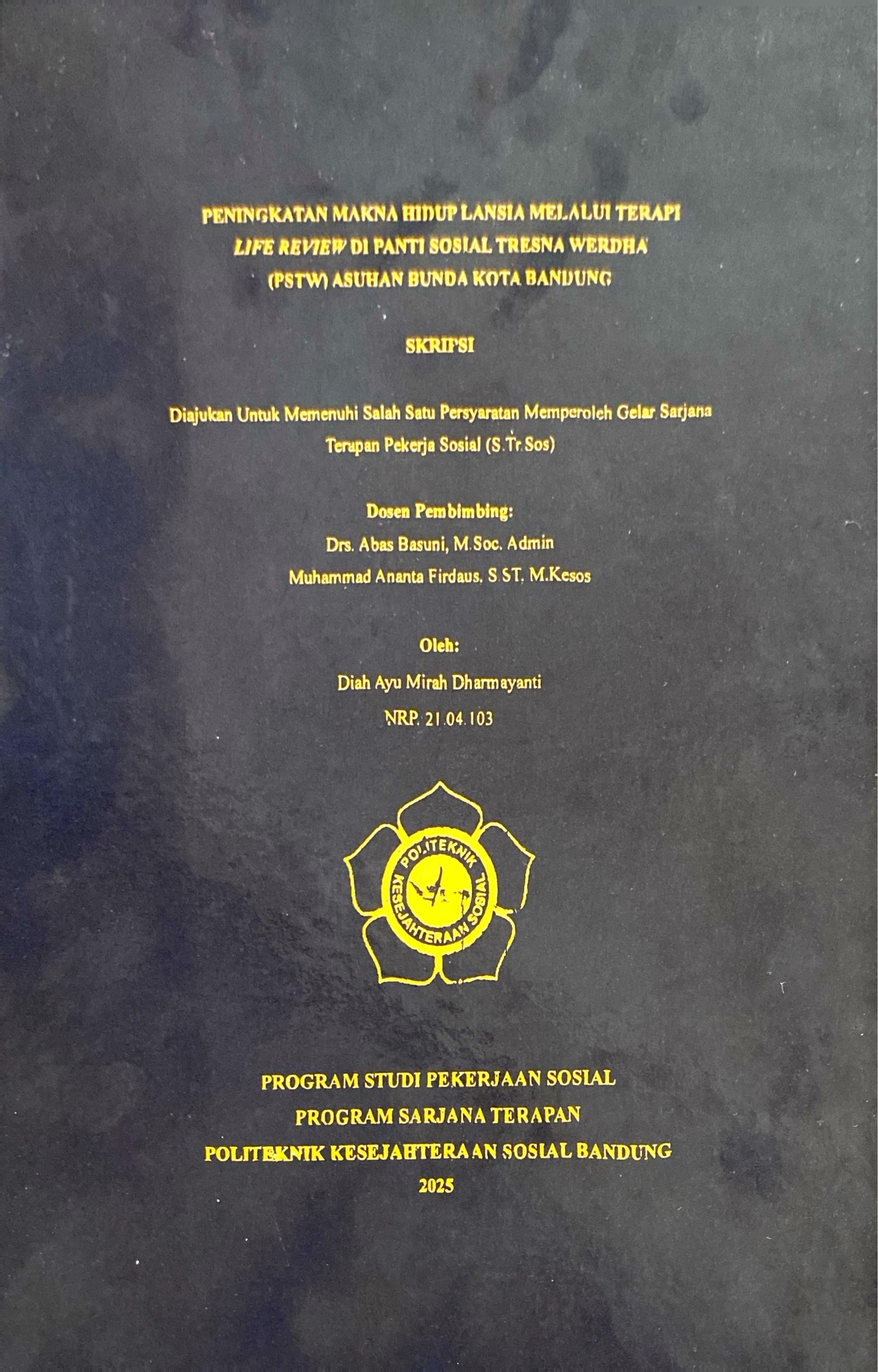 DIAH AYU MIRAH DHARMAYANTI, NRP. 21.04.103. Peningkatan Makna Hidup Lansia Melalui Terapi Life Review Di Panti Sosial Tresna Werdha (PSTW) Asuhan Bunda Kota Bandung. Dibimbing oleh ABAS BASUNI dan MUHAMMAD ANANTA FIRDAUS Penelitian ini bertujuan untuk mengetahui peningkatan makna hidup lansia melalui penerapan terapi life review di Panti Sosial Tresna Werdha (PSTW) Asuhan Bunda, Kota Bandung. Latar belakang penelitian didasari oleh meningkatnya jumlah lansia di Indonesia dan risiko kehilangan makna hidup akibat perubahan psikososial pada usia lanjut. Terapi life review merupakan pendekatan reflektif yang membantu lansia meninjau kembali pengalaman hidup untuk menemukan makna, harga diri, dan penerimaan diri. Metode yang digunakan adalah deskriptif kuantitatif dengan instrumen kuesioner. Aspek makna hidup yang dikaji mengacu pada teori Viktor Frankl, yaitu nilai penciptaan (creative values), nilai pengalaman (experiential values), dan nilai sikap terhadap penderitaan (attitudinal values). Hasil penelitian menunjukkan adanya peningkatan positif pada ketiga aspek makna hidup. Aspek pengalaman memperoleh skor tertinggi sebesar 82,61%, diikuti nilai penciptaan sebesar 68,33%, dan sikap terhadap penderitaan sebesar 68,94%. Berdasarkan temuan tersebut, peneliti merancang program lanjutan bernama Sahabat Diri untuk memperluas efektivitas terapi melalui pendekatan partisipatif. Penelitian ini merekomendasikan penerapan terapi life review secara berkelanjutan dalam pelayanan lansia sebagai upaya promotif dan preventif dalam pekerjaan sosial gerontologi. Kata Kunci: terapi life review, peningkatan, makna hidup.