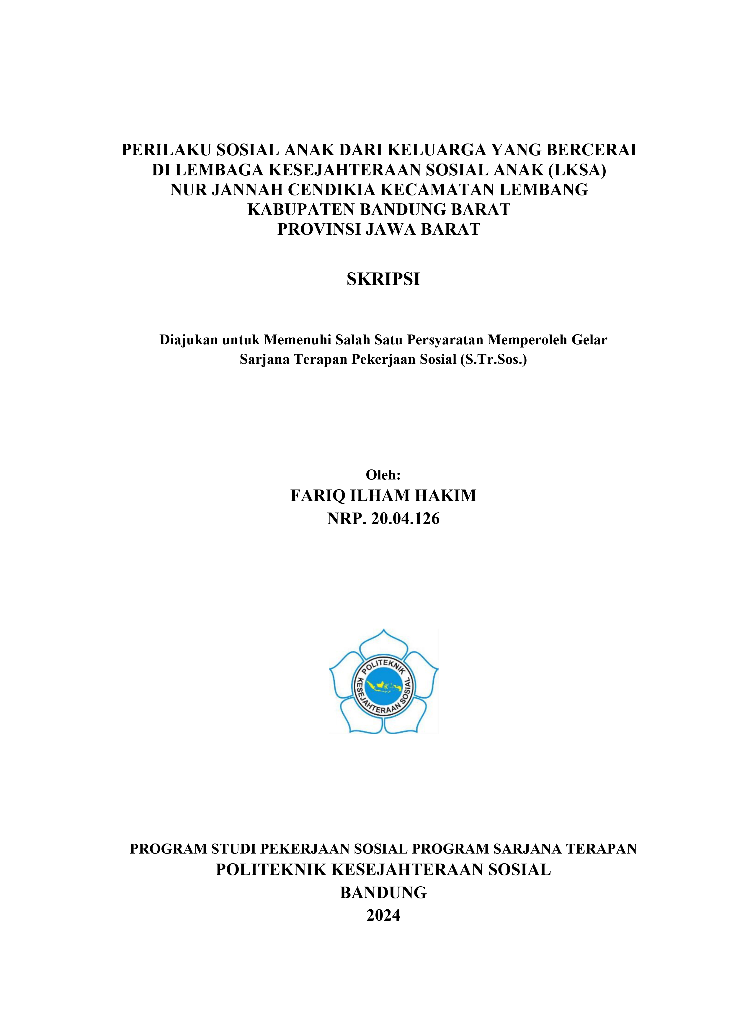 FARIQ ILHAM HAKIM, NRP.20.04.126 Perilaku Sosial Anak dari Keluarga yang Bercerai di Lembaga Kesejahteraan Sosial Anak (LKSA) Nur Jannah Cendikia Kecamatan Lembang Kabupaten Bandung Barat Provinsi Jawa Barat,