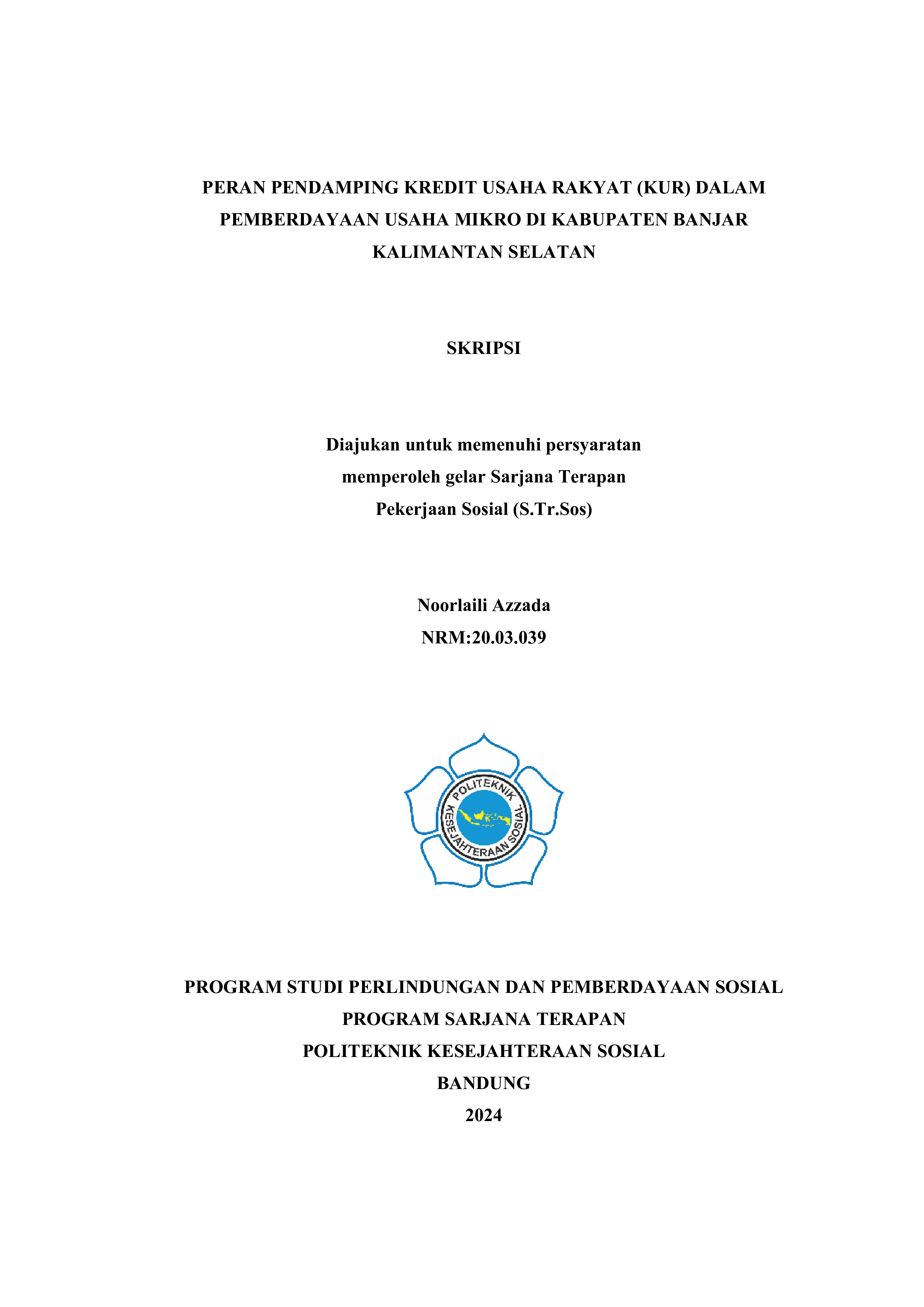NOORLAILI AZZADA NRM. 20.03.039. The Companion Role of People's Business Credit (KUR) in Empowering Micro Enterprises in Banjar Regency, South Kalimantan. Supervisors: HELLY OCKTILIA and MILLY MILDAWATI. This research aims to find out comprehensively about the role of supporting people's business credit (KUR) in empowering micro businesses in Banjar Regency, South Kalimantan using four aspects, namely: (1) the role of facilitator; (2) the role of educators; (3) the role of micro business representatives; (4) technical role. The method used in this research is a qualitative approach with a descriptive design. The data sources used are primary data sources and secondary data sources. This research used a purposive sampling technique to determine informants consisting of one head of micro business sector the Banjar Regency Cooperatives, Micro Enterprises, Industry and Trade Department, one KUR Facilitator in the Tabuk River area, and six micro business actors located in three locations, namely Kertak Hanyar, Tabuk River, and Peat. Data collection techniques were carried out using observation, in-depth interviews, and documentation studies. The results of the research show that the role of the People's Business Credit (KUR) assistant in empowering micro businesses in Banjar Regency, South Kalimantan has gone well in three aspects, namely the role of facilitator, educator and micro business representative, while the KUR companion in the technical role aspect has not been carried out well. This is caused by technical obstacles, namely manual data collection using paper, lack of knowledge of computers accompanying KUR, and inadequate education regarding management and financial control. The proposed program designed as an alternative to this research problem is the program for Increasing the Technical Role of KUR through Credit Information System Training Program (SIKP) and Financial Management." Keywords: Companion Role, Micro Business Credit, Micro Business Empowerment. ABSTRAK NOORLAILI AZZADA. NRM. 20.03.039. Peran Pendamping Kredit Usaha Rakyat (KUR) dalam Pemberdayaan Usaha Mikro di Kabupaten Banjar Kalimantan Selatan. Dosen Pembimbing : HELLY OCKTILIA dan MILLY MILDAWATI Penelitian ini bertujuan untuk mengetahui secara komprehensif tentang Peran Pendamping Kredit Usaha Rakyat (KUR) dalam Pemberdayaan Usaha Mikro di Kabupaten Banjar Kalimantan Selatan menggunakan empat aspek yaitu: (1) peran fasilitator; (2) peran pendidik; (3) peran perwakilan usaha mikro; (4) peranan teknis. Metode yang digunakan dalam penelitian ini yaitu pendekatan kualitatif dengan desain deskriptif. Sumber data yang digunakan yaitu sumber data primer dan sumber data sekunder. Penelitian ini menggunakan teknik purposive sampling untuk menentukan informan yang terdiri dari Kepala Bidang Usaha Mikro Dinas Koperasi, Usaha Mikro, Perindustrian dan Perdagangan Kabupaten Banjar, Pendamping KUR wilayah Sungai Tabuk, dan enam pelaku usaha mikro yang berada di tiga lokasi yaitu Kertak Hanyar, Sungai Tabuk, dan Gambut. Teknik pengumpulan data dilakukan dengan observasi, wawancara mandalam, dan studi dokumentasi. Hasil penelitian menunjukkan bahwa Peran Pendamping Kredit Usaha Rakyat (KUR) dalam Pemberdayaan Usaha Mikro di Kabupaten Banjar Kalimantan Selatan telah berjalan dengan baik dalam tiga aspek, yakni peran fasilitator, pendidik dan perwakilan usaha mikro, sementara pendamping KUR dalam aspek peranan teknis belum terlaksana baik. Hal ini disebabkan oleh kendala teknik, yakni pengumpulan data masih manual menggunakan kertas, kurangnya pengetahuan komputer pendamping KUR, dan edukasi terkait manajemen serta pengendalian keuangan yang belum memadai. Usulan program yang dirancang sebagai alternatif permasalahan penelitian ini adalah program Peningkatan Peranan Teknis KUR Melalui Pelatihan Sistem Informasi Kredit Program (SIKP) dan Manajemen Finansial”. Kata Kunci: Peran Pendamping, Kredit Usaha Mikro, Pemberdayaan Usaha Mikro