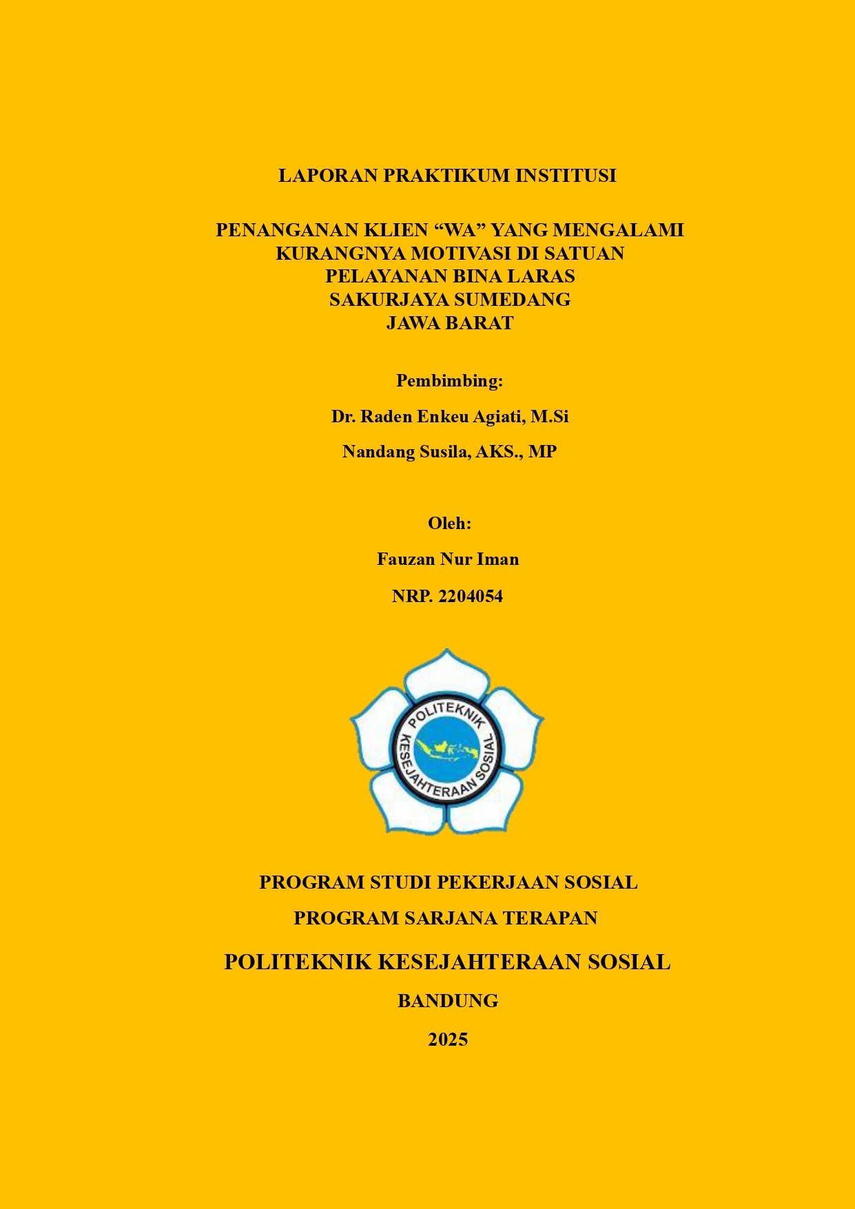 LAPORAN PRAKTIKUM INSTITUSI PENANGANAN KLIEN “WA” YANG MENGALAMI KURANGNYA MOTIVASI DI SATUAN PELAYANAN BINA LARAS SAKURJAYA SUMEDANG JAWA BARAT