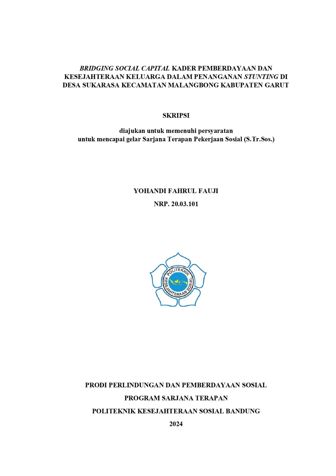 YOHANDI FAHRUL FAUJI, NRP. 20.03.101 Bridging Social Capital Kader Pemberdayaan dan Kesejahteraan Keluarga dalam Penanganan Stunting di Desa Sukarasa Kecamatan Malangbong Kabupaten Garut. Dosen Pembimbing: Admiral Nelson Aritonang dan Aribowo. Penanganan permasalahan stunting merupakan salah satu isu strategis nasional di Indonesia. Angka stunting di Kabupaten Garut pada tahun 2023 berada pada angka 21,3% dengan target penurunan hingga dibawah 14%. Pada tahun 2018 Desa Sukarasa dikategorikan sebagai 20 desa tertinggi untuk angka stunting atau disebut lokasi fokus stunting. Kemudian pada tahun 2022 Desa Sukarasa berhasil keluar dari status lokasi fokus stunting berkat upaya Kader Pemberdayaan dan Kesejahteraan Keluarga (PKK) dalam memanfaatkan interaksi dan kolaborasi dengan jaringan sosialnya sebagai komponen dari bridging social capital. Penelitian ini mengkaji terkait dengan interaksi yang terdiri dari pertukaran informasi, media komunikasi, dan kerjasama serta kolaborasi-kolaborasi yang dijalin oleh Kader PKK dengan jaringan sosialnya. Pada prosesnya penelitian ini menggunakan metode kualitatif dengan pengumpulan data melalui wawancara mendalam, observasi, dan studi dokumentasi. Hasil penelitian menunjukan bahwa dari interaksi dari Kader PKK dengan jaringan sosialnya terdapat saling bertukar informasi tentang stunting, dengan media komunikasi secara langsung dan memanfaatkan perkembangan teknologi. Kemudian terdapat kerjasama dan kolaborasi yang terjalin untuk menyelenggarakan program dan kegiatan mengurangi persentase stunting di Desa Sukarasa. Hasil dari interaksi dan kolaborasi tersebut adalah adanya peningkatan pengetahuan dan perluasan akses kepemilikan aset dari PKK serta berhasil mengeluarkan Desa Sukarasa dari status lokus stunting. Namun dalam kemampuan dalam berjejaring, Kader PKK belum maksimal untuk membangun jaringan sosial diluar bidang kesehatan pemerintah. Program PKK Learn and Link diselenggaraakan dalam rangka memperluas bridging social capital yang dimiliki oleh Kader PKK Desa Sukarasa. Kata Kunci: Stunting, Bridging Social Capital, Kader Pemberdayaan dan Kesejahteraan Keluarga ABSTRACT YOHANDI FAHRUL FAUJI, NRP. 20.03.101 Bridging Social Capital of PKK Cadres in Handling Stunting in Desa Sukarasa, Malangbong District, Garut City. Supervisor: Admiral Nelson Aritonang and Aribowo. Handling the issue of stunting is one of the national strategic issues in Indonesia. The stunting rate in Kabupaten Garut in 2023rd was 21.3%, with a target reduction to below 14%. In 2018th Desa Sukarasa was categorized as one of the 20 villages with the highest stunting rates, referred to as stunting focus locations. However, in 2022nd Desa Sukarasa successfully exited the status of a stunting focus location thanks to the efforts of the Pemberdayaan dan Kesejaheraan Keluarga (PKK) Cadres in utilizing interaction and collaboration with their social networks as a component of bridging social capital. This study examines the interactions, which consist of information exchange, communication media, and cooperation and collaborations established by the PKK Cadres with their social networks. This research employs a qualitative method, with data collection through in-depth interviews, observations, and documentation studies. The results show that the interaction between the PKK Cadres and their social networks involves exchanging information about stunting, using direct communication media, and leveraging technological advancements. Additionally, cooperation and collaboration have been established to organize programs and activities to reduce the percentage of stunting in Desa Sukarasa. The outcomes of these interactions and collaborations include increased knowledge and expand access to asset ownership for the PKK, which successfully removed Desa Sukarasa from the stunting focus locations status. However, in terms of networking capabilities, the PKK Cadres have not fully maximized building social networks outside the government's health sector. The PKK Learn and Link program is organized to expand the bridging social capital possessed by the PKK Cadres of Desa Sukarasa. Keywords: Stunting, Bridging Social Capital, Pemberdayaan dan Kesejahteraan Keluarga Caders
