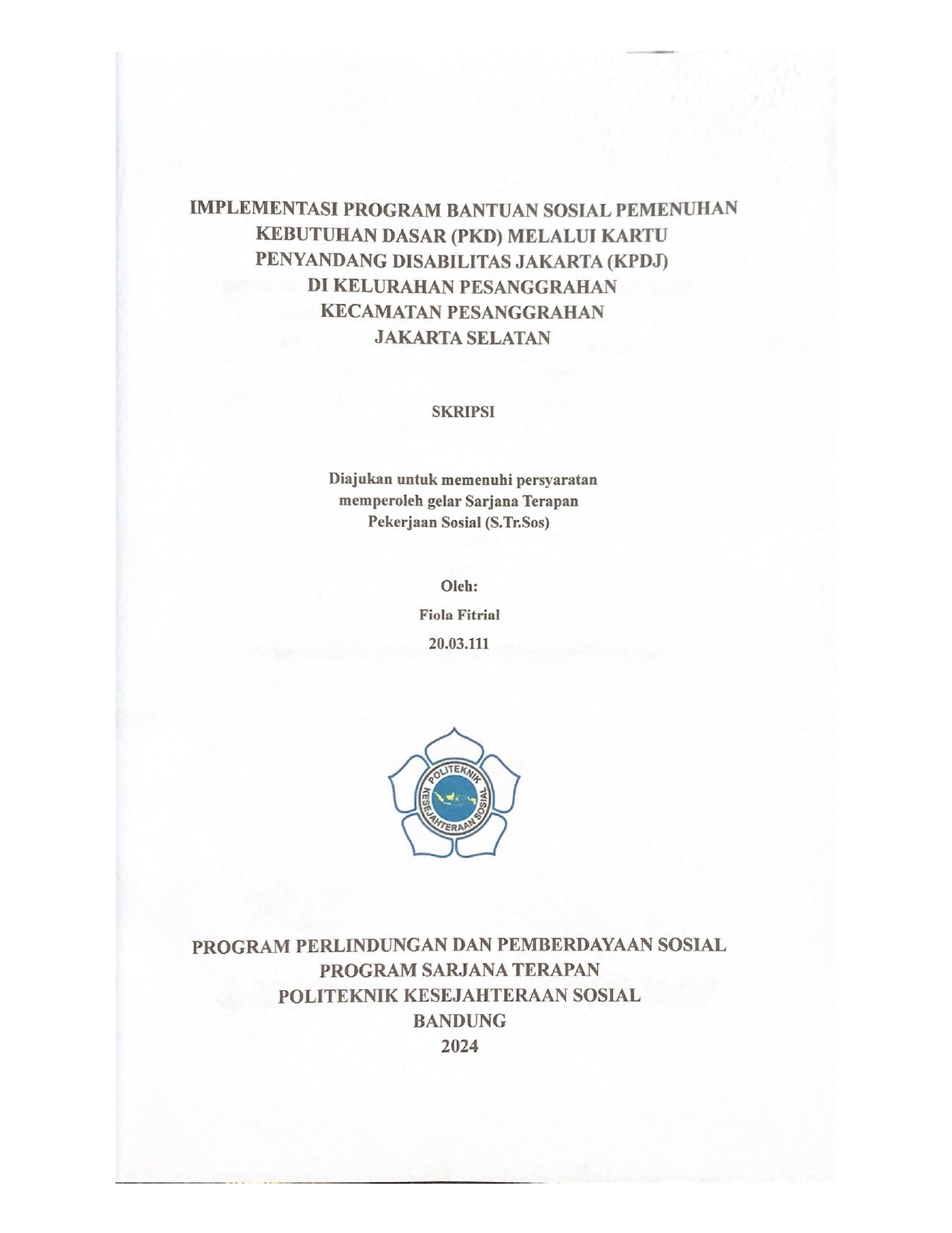 FIOLA FITRIAL, 20.03.111, Implementasi Program Bantuan Sosial Pemenuhan Kebutuhan Dasar (PKD) Melalui Kartu Penyandang Disabilitas Jakarta (KPDJ) Di Kelurahan Pesanggrahan Kecamatan Pesanggrahan Jakarta Selatan.