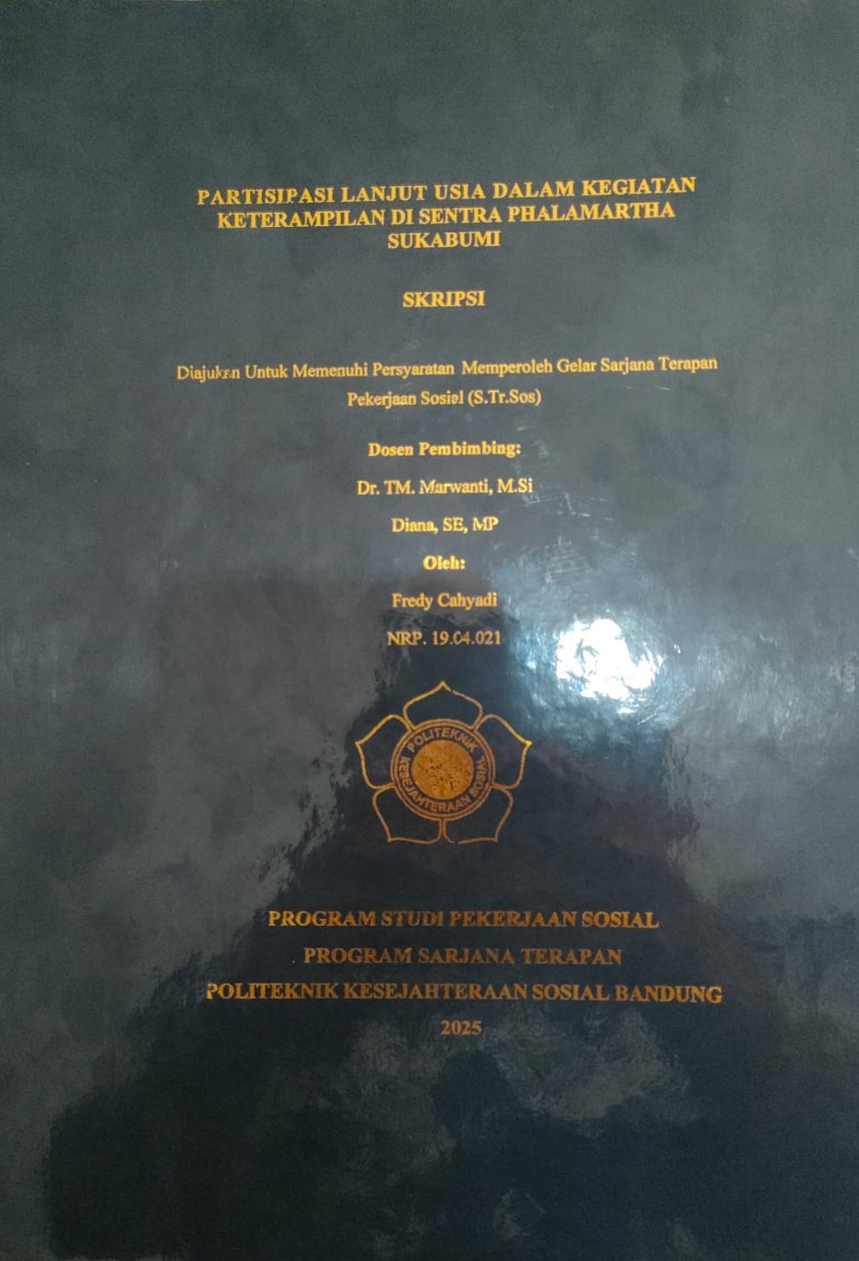 FREDY CAHYADI, 19.04.21. Partisipasi Lanjut Usia Dalam Kegiatan Keterampilan Di Sentra Phalamartha Sukabumi. Dibimbing oleh T.M MARWANTI dan DIANA Kegiatan Keterampilan di Sentra Phalamartha Sukabumi cukup beragam. Kegiatan Keterampilan tersebut dilaksanakan agar lanjut usia tetap bisa produktif. Tujuan dilakukannya penelitian Partisipasi Lanjut Usia Dalam Kegiatan Keterampilan di Sentra Phalamartha Sukabumi agar dapat memperoleh informasi dan penjelasan tentang pengetahuan mengenai peningkatan keterampilan lanjut usia dalam melaksanakan kegiatan pelatihan di Sentra. Aspek yang diteliti dari penelitian ini adalah bagaimana karakteristik informan lansia di sentra, bagaimana bentuk-bentuk kegiatan keterampilan lansia yang ada di sentra, bagaimana bentuk partisipasi lansia dalam mengikuti kegiatan keterampilan di sentra, bagaimana intensitas lansia dalam memberikan sumbangan pikiran, keahlian, tenaga, dan waktu, bagaimana manfaat yang dirasakan lansia setelah berpartisipasi dalam kegiatan di sentra, dan apa saja faktor penghambat dan pendukung yang dirasakan lansia dalam partisipasi kegiatan di sentra. Metode yang digunakan penelitian ini adalah deskriptif dengan pendekatan kualitatif dan teknik pengumpulan data melalui wawancara mendalam, observasi, dan studi dokumentasi. Sumber data utama dalam penelitian ini sebanyak enam orang informan. Teknik analisis data yang digunakan adalah teknik analisa data kualitatif. Hasil dari penelitian yang dilakukan Kegiatan yang diikuti oleh Informan adalah keterampilan menjahit dan keterampilan beternak. Kegiatan keterampilan yang diselenggarakan di Sentra dirancang untuk menyesuaikan kondisi fisik, minat, serta kemampuan masing masing lansia. Kegiatan tersebut berfungsi tidak hanya untuk mengisi waktu luang, tetapi juga sebagai sarana stimulasi kognitif, peningkatan motorik halus, serta penguatan kesehatan mental lansia. Berdasarkan hasil penelitian dan analisa masalah dan kebutuhan yang dilakukan, maka program yang peneliti rekomendasikan yaitu Partisipasi lanjut usia pada kegiatan keterampilan melalui kegiatan sosialisasi dan pelatihan. Kegiatan Sosialisasi dilaksanakan agar lanjut usia mengetahui kegiatan yang ada di Sentra danmenumbuhkan semangat kepada lanjut usia agar dapat aktif mengikuti kegiatan keterampilan. Sedangkan kegiatan pelatihan dilaksanakan agar lanjut usia lebih memahami Teknik dalam kegiatan keterampilan yang diikuti. Kata Kunci : Partisipasi, Lanjut usia, Kegiatan Keterampilan