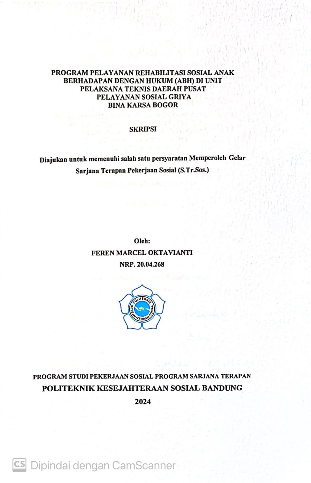 FEREN MARCEL OKTAVIANTI, NRP. 20.04.268. Program Pelayanan Rehabilitasi Sosial Anak Berhadapan dengan Hukum (ABH) di UPTD Pusat Pelayanan Sosial Griya Bina Karsa Bogor,