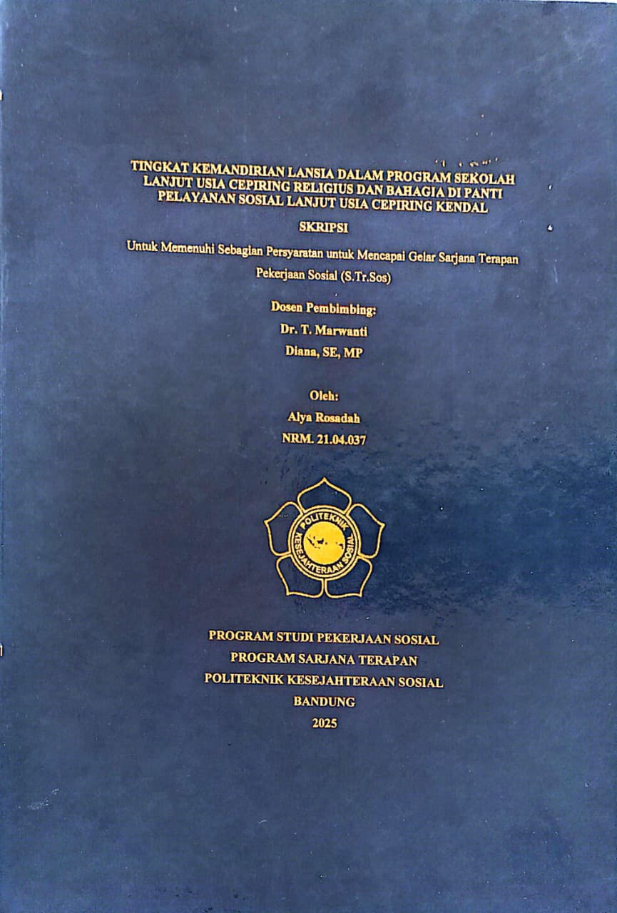 ALYA ROSADAH, 21.04.037. Tingkat Kemandirian Lansia dalam Program Sekolah Lanjut Usia Cepiring Religius dan Bahagia di Panti Pelayanan Sosial Lanjut Usia Cepiring Kendal. Dibimbing oleh Theresia Martina Marwanti dan Diana. Kemandirian adalah ketika seseorang mampu melakukan segala sesuatunya sendiri, bertanggung jawab atas apa yang dilakukannya, mampu mengendalikan tingkah laku, perasaan, dan pikiran diri sendiri, dan mampu mengambil keputusan secara mandiri, serta tidak bergantung pada orang lain. Penelitian ini bertujuan untuk memperoleh gambaran secara empiris tentang: 1) karakteristik responden, 2) kemandirian intelektual, 3) kemandirian sosial, 4) kemandirian emosi, 5) kemandirian ekonomi. Metode yang digunakan adalah penelitian kuantitatif dengan deskriptif. Populasi sebesar 60 responden dan menggunakan total sampling atau sensus, dimana mengambil seluruh populasi sebagai sampel sebesar 60 responden. Teknik pengumpulan data yang digunakan adalah kuesioner dan studi dokumentasi. Uji validitas alat ukur menggunakan validasi muka (face validity) dan uji reliabilitas menggunakan rumus Alpha Cronbach. Instrument penelitian menggunakan rating scale. Hasil penelitian menunjukkan bahwa pada aspek kemandirian intelektual dalam kategori sedang dengan skor 1.250 dari skor ideal 1.680 dengan presentase 21,39%, aspek kemandirian sosial termasuk dalam kategori tinggi dengan skor 1.971 dari skor ideal 2.400 dengan presentase (33,72%), aspek kemandirian emosi termasuk dalam kategori tinggi dengan skor 1.674 dari skor ideal 1.920 dengan presentase (28,64%) dan aspek kemandirian ekonomi termasuk dalam kategori sedang dengan skor 950 dari skor ideal 1.440 dengan presentase (16,25%). Sebagian besar lansia memiliki tingkat kemandirian intelektual dalam kategori sedang. Kondisi ini menjadi urgensi tersendiri karena kemandirian intelektual berperan penting dalam menjaga kualitas hidup lansia. Menurunnya fungsi kognitif, hingga peningkatan risiko stres dan depresi. Berdasarkan urgensi tersebut, peneliti mengusulkan program Latih Kognitif Lansia di panti Pelayanan Sosial Lanjut Usia Cepiring Kendal. Kata Kunci: Tingkat Kemandirian, Lanjut Usia, Program Sekolah Lanjut Usia Cepiring Religius dan Bahagia (Salsa Ceria), Panti Pelayanan Sosial Lanjut Usia Cepiring Kendal