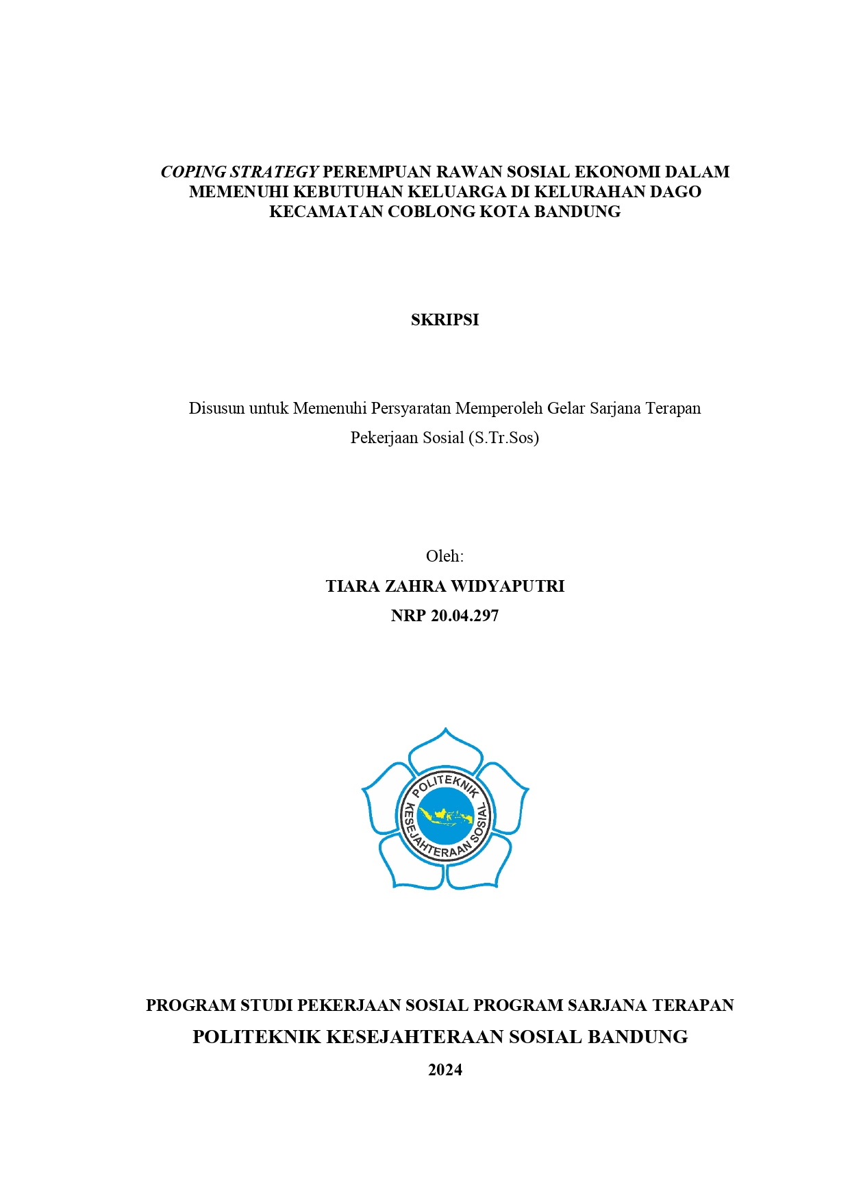 Coping Strategy Perempuan Rawan Sosial Ekonomi dalam Memenuhi Kebutuhan Keluarga di Kelurahan Dago, Kecamatan Coblong, Kota Bandung.