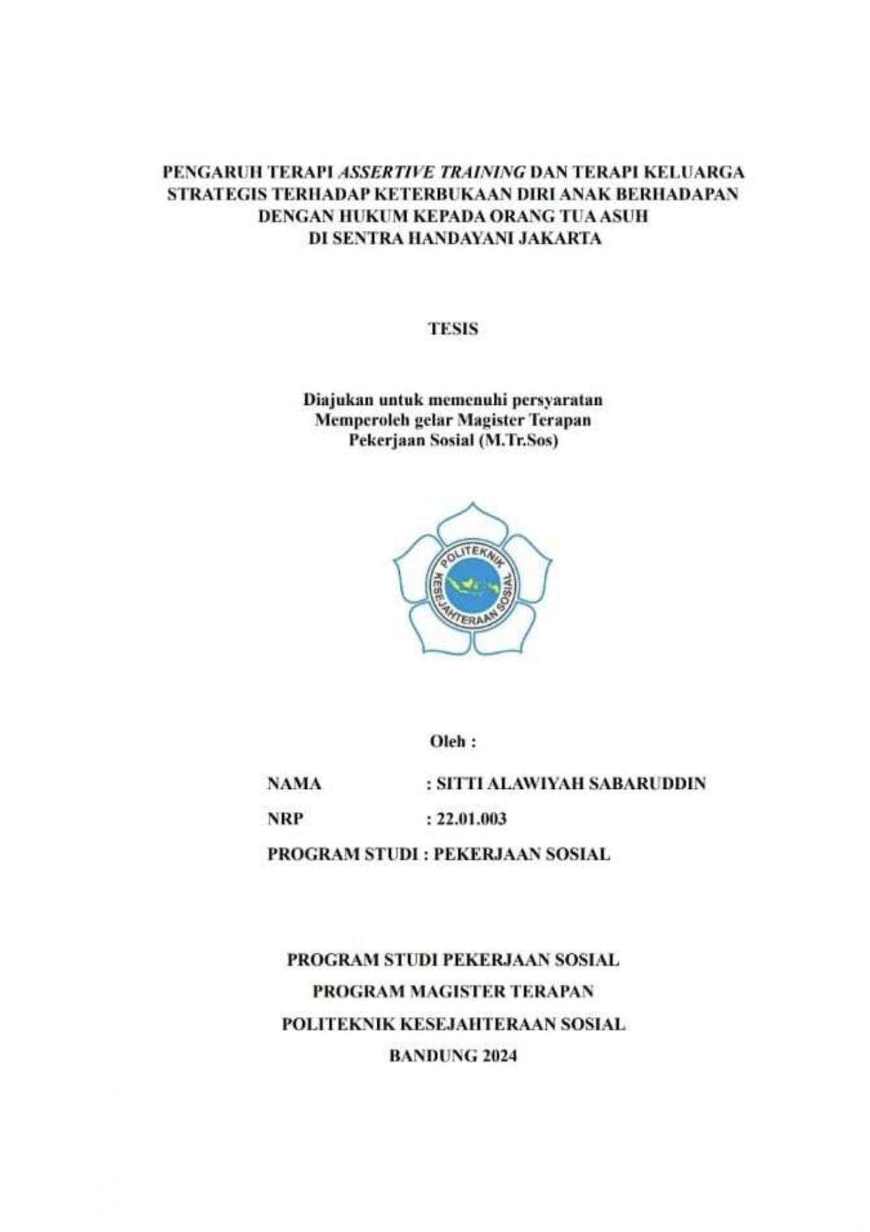 Pengaruh Terapi Assertive Training dan Terapi Keluarga Strategis terhadap Keterbukaan Diri Anak Berhadapan dengan Hukum (ABH) kepada Orang Tua Asuh di Sentra Hndayani Jakarta.