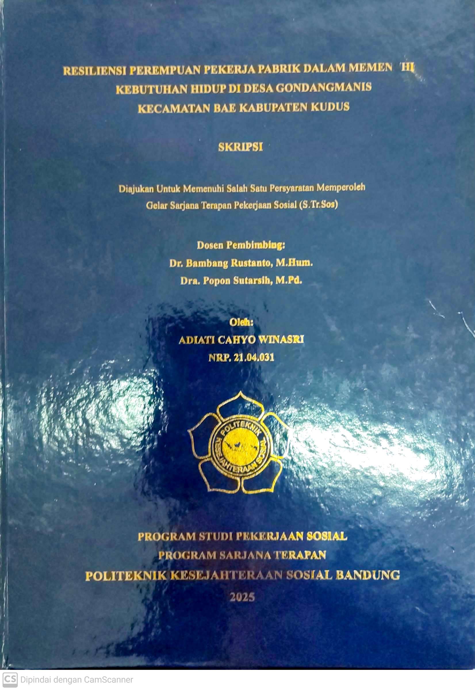 ADIATI CAHYO WINASRI. NRP. 21.04.031. Resiliensi Perempuan Pekerja Pabrik dalam Memenuhi Kebutuhan Hidup di Desa Gondangmanis Kecamatan Bae Kabupaten Kudus. Skripsi, Sarjana Terapan Pekerjaan Sosial Poltekesos Bandung. Dibimbing oleh BAMBANG RUSTANTO dan POPON SUTARSIH