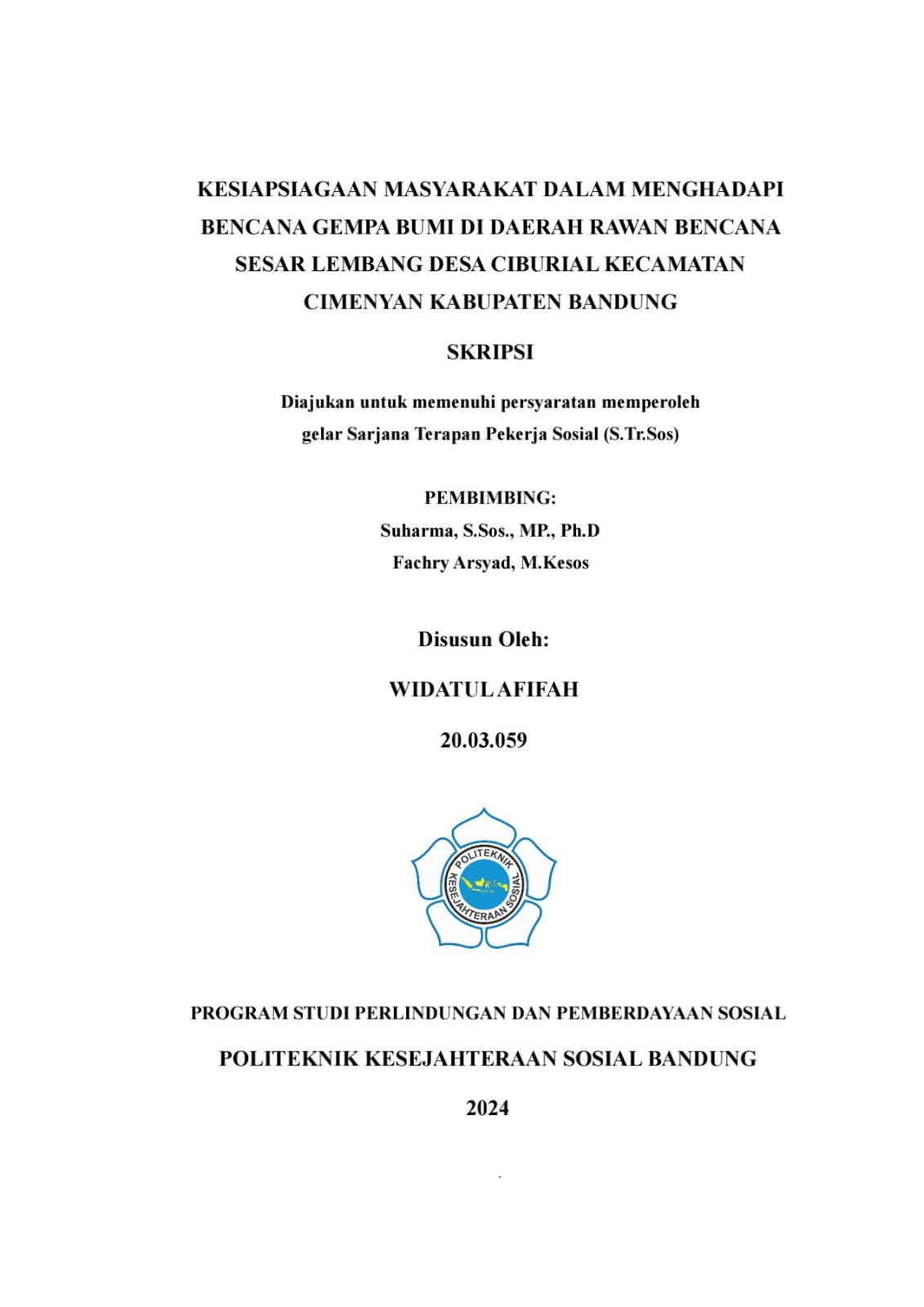 WIDATUL AFIFAH. 20.03.059. Kesiapsiagaan Masyarakat Dalam Menghadapi Bencana Gempa Bumi Di Daerah Rawan Bencana Sesar Lembang Desa Ciburial Kecamatan Cimenyan Kabupaten Bandung.