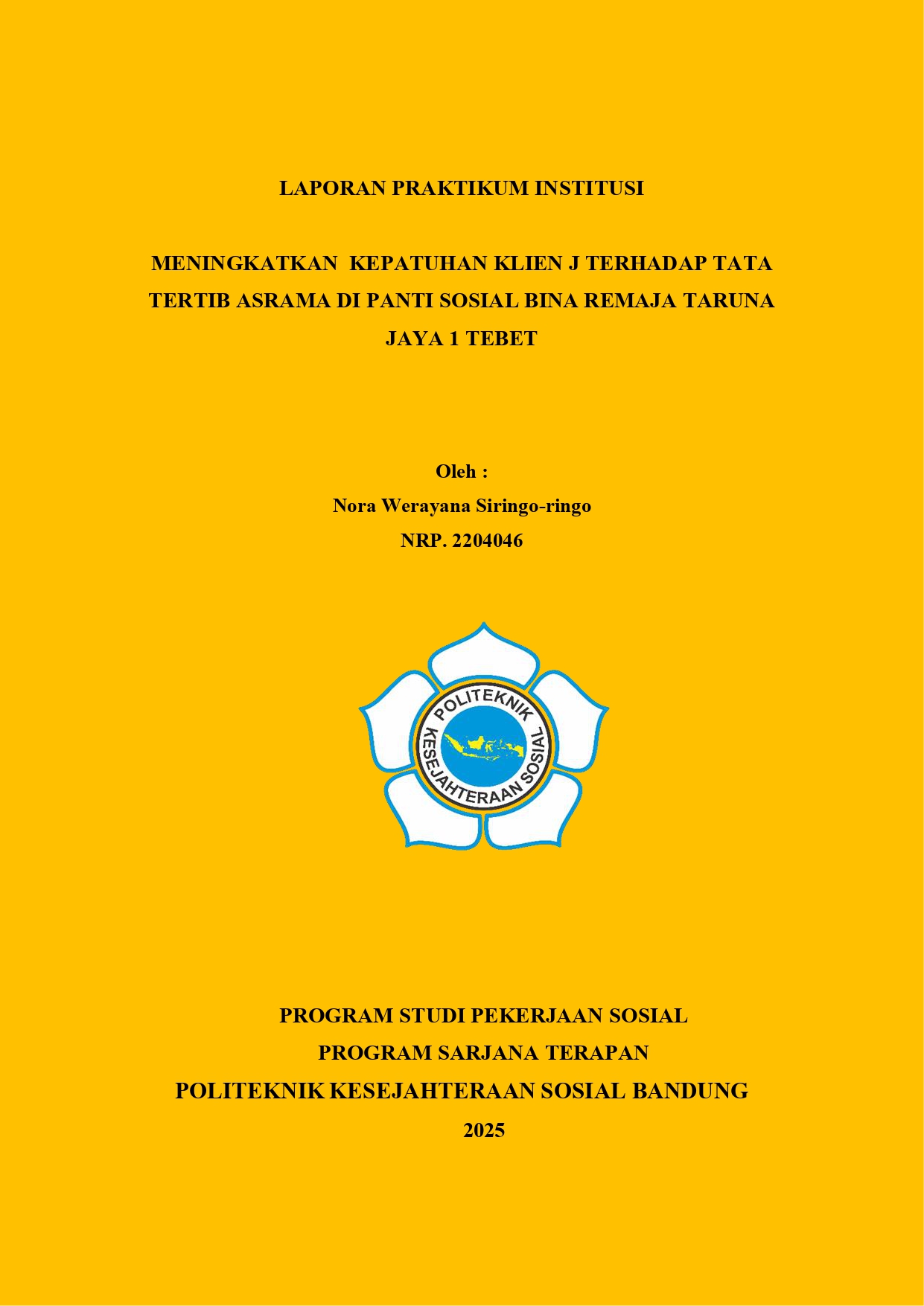 LAPORAN PRAKTIKUM INSTITUSI MENINGKATKAN KEPATUHAN KLIEN J TERHADAP TATA TERTIB ASRAMA DI PANTI SOSIAL BINA REMAJA TARUNA JAYA 1 TEBET