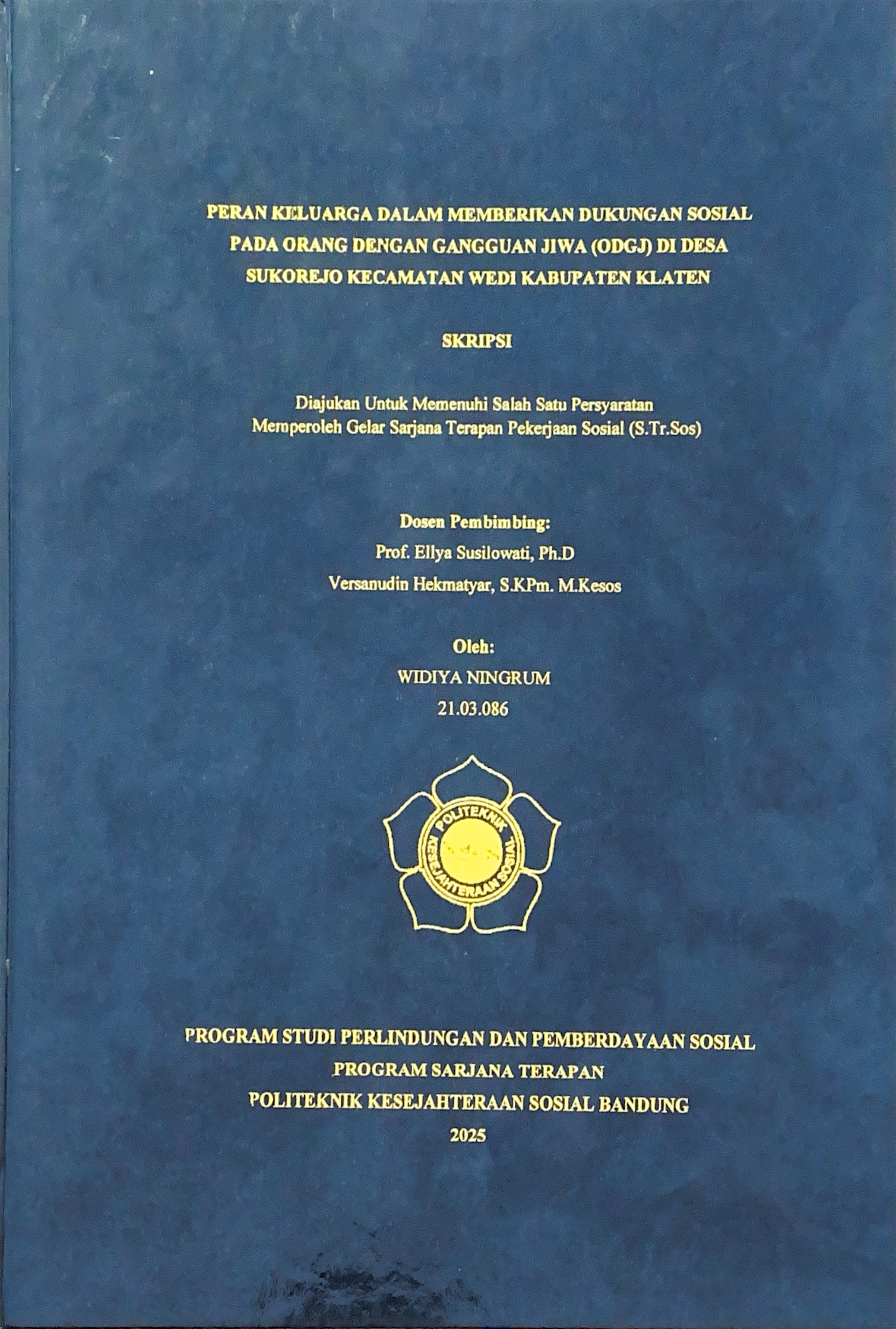 WIDIYA NINGRUM, NRM. 21.03.086. Peran Keluarga dalam Memberikan Dukungan Sosial bagi Orang dengan Gangguan Jiwa (ODGJ) di Desa Sukorejo, Kecamatan Wedi, Kabupaten Klaten. Dibimbing oleh ELLYA SUSILOWATI, dan VERSANUDIN HEKMATYAR Penelitian ini dilatarbelakangi oleh meningkatnya jumlah kasus Orang dengan Gangguan Jiwa (ODGJ) di masyarakat, termasuk di Desa Sukorejo, serta masih terbatasnya dukungan sosial yang diberikan keluarga dan masyarakat dalam proses pemulihan. Tujuan penelitian ini adalah untuk menggambarkan peran keluarga dalam memberikan dukungan sosial terhadap ODGJ, serta mengidentifikasi hambatan yang dihadapi selama proses perawatan. Penelitian ini menggunakan metode kualitatif deskriptif dengan teknik pengumpulan data melalui wawancara mendalam, observasi, dan studi dokumentasi. Informan terdiri dari lima keluarga pengasuh ODGJ. Analisis data dilakukan melalui proses open coding, axial coding, dan selective coding. Hasil penelitian menunjukkan bahwa keluarga telah memberikan dukungan sosial dalam empat bentuk: emosional, instrumental, informasi, dan penilaian. Namun, dukungan sosial ini mengalami penurunan akibat beban pengasuhan jangka panjang, keletihan psikologis (caregiver fatigue), ketegangan relasi antar anggota keluarga, serta kecemburuan dari anggota keluarga lain. Di sisi lain, keluarga juga menghadapi hambatan eksternal berupa stigma sosial dan terbatasnya dukungan dari lingkungan maupun institusi formal. Berdasarkan temuan tersebut, peneliti merancang program intervensi “SAPA JIWA” (Sarana Pendampingan Keluarga untuk Pemulihan Jiwa) sebagai upaya untuk memperkuat kapasitas emosional keluarga dan mengembangkan sistem dukungan sosial berbasis komunitas melalui pelibatan masyarakat, kader kesehatan, serta fasilitasi oleh pekerja sosial. Program ini diharapkan dapat menjadi model pemberdayaan keluarga ODGJ berbasis lokal yang berkelanjutan dan inklusif. Kata Kunci: Dukungan Sosial, Keluarga Pengasuh, ODGJ, Caregiver Fatigue, Pekerja Sosial, Desa Sukorejo