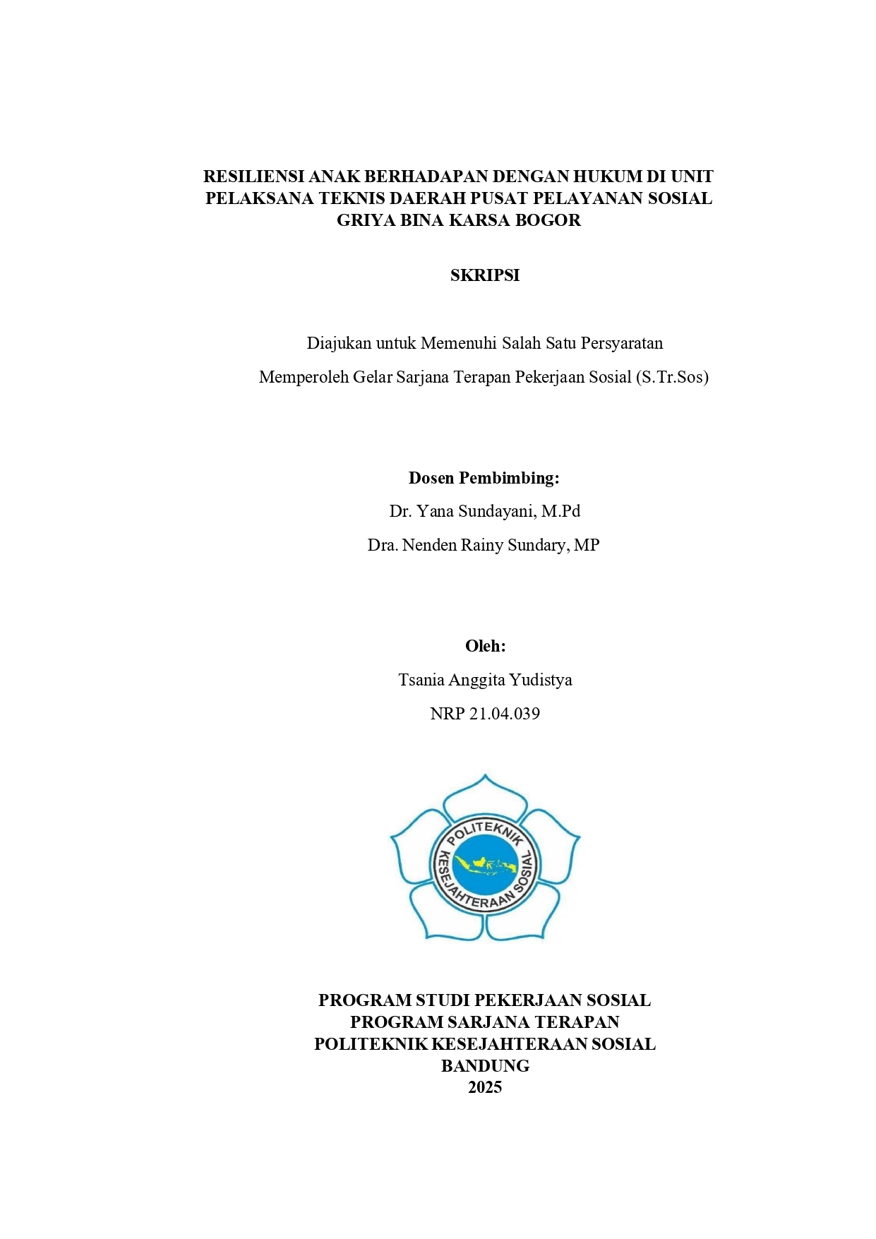 TSANIA ANGGITA YUDISTYA, NRP. 21.04.039. Resiliensi Anak Berhadapan dengan Hukum di Unit Pelaksana Teknis Daerah Pusat Pelayanan Sosial Griya Bina Karsa Bogor. Dosen Pembimbing: YANA SUNDAYANI dan NENDEN RAINY SUNDARY.