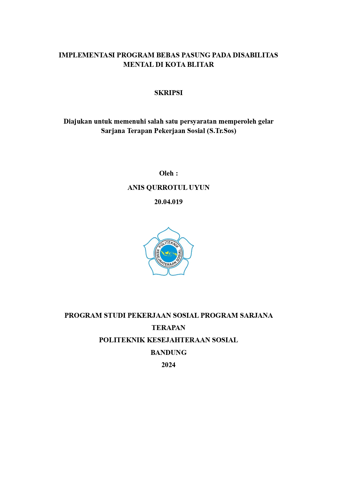 ANIS QURROTUL UYUN. 20.04.019 Implementasi Program Bebas Pasung Pada Disabilitas Mental di Kota Blitar.