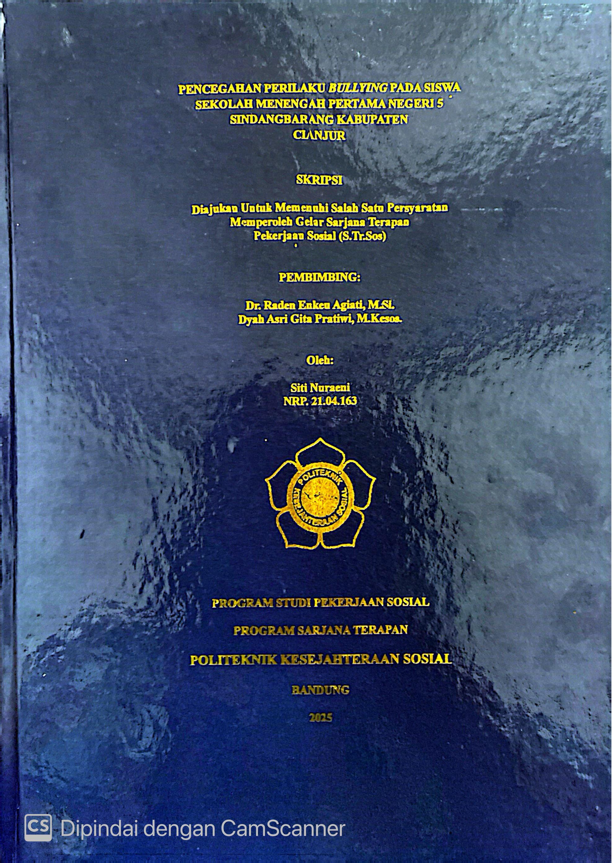 SITI NURAENI, NRP. 21.04.163 Pencegahan Perilaku Bullying pada Siswa Sekolah Menengah Pertama Negeri 5 Sindangbarang Kabupaten Cianjur. Dosen pembimbing: Raden Enkeu Agiati dan Dyah Asri Gita Pratiwi Pencegahan perilaku bullying merupakan upaya proaktif yang dilakukan untuk mengurangi risiko dan dampak negatifnya terhadap individu maupun lingkungan sosial. Penelitian ini mengkaji strategi Pencegahan perilaku bullying yang bersifat persuasif dan represif. Penelitian ini bertujuan untuk menggambarkan secara empiris tentang: 1) karakteristik responden, 2) pencegahan secara persuasif, dan 3) pencegahan secara represif. Metode yang digunakan dalam penelitian ini adalah metode penelitian kuantitatif dengan survey deskriptif. Sumber yang digunakan adalah sumber primer dan sekunder. Responden penelitian adalah 40 siswa SMPN 5 Sindangbarang Kabupaten Cianjur. Teknik pengambilan sampel adalah stratified random sampling. Adapun teknik pengumpulan data yang digunakan yaitu: 1) angket, dan 2) studi dokumentasi. Instrument dalam penelitian menggunakan rating scale. Uji validitas alat ukur yang digunakan adalah uji validitas muka (face validity), dan uji reabilitas alat ukur menggunakan Alpha Cronbach. Hasil penelitian menunjukkan bahwa pencegahan perilaku bullying pada siswa secara persuasif melalui penyuluhan berada pada kategori sedang. Hal ini menunjukkan pencegahan ini kurang optimal, oleh karena itu diusulkan program “Cegah Bullying sejak Dini (CEBUNI) terhadap siswa SMPN 5 Sindangbarang Kabupaten Cianjur”. Kata Kunci: Pencegahan, Perilaku Bullying, Pencegahan Persuasif, Pencegahan Represif.