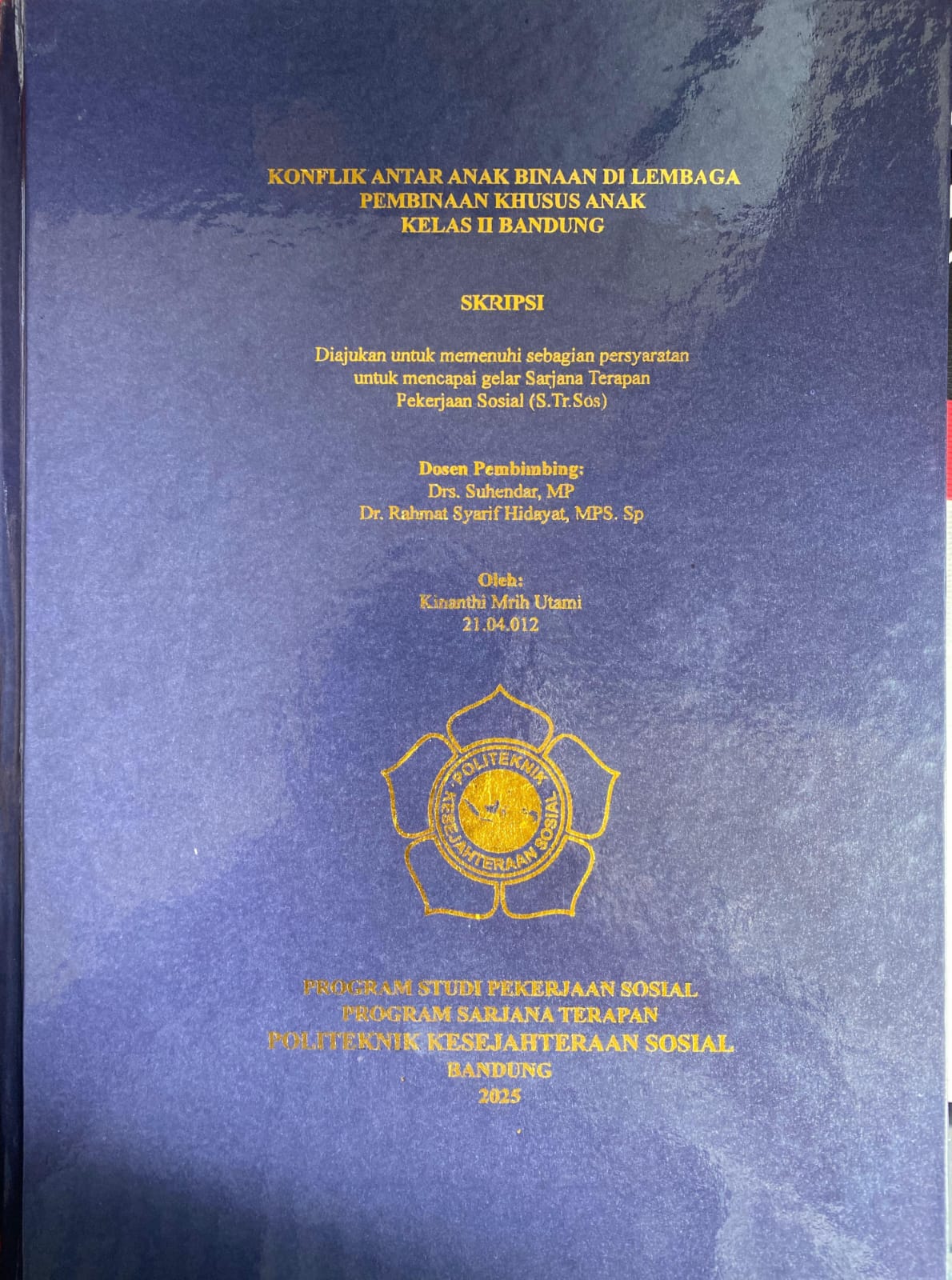 KINANTHI MRIH UTAMI. NRP. 21.04.012. Konflik Antar Anak Binaan di Lembaga Pembinaan Khusus Anak Kelas II Bandung. Dibimbing oleh SUHENDAR dan RAHMAT SYARIF HIDAYAT Konflik merupakan sebuah proses interaktif yang tidak bisa dihindari dalam sebuah kehidupan sosial. Konflik dapat terjadi karena adanya pandangan, kepentingan, dan keyakinan yang berbeda antar individu. Penelitian ini bertujuan untuk memperoleh gambaran empiris terkait tingkat konflik antar anak binaan di Lembaga Pembinaan Khusus Anak Kelas II Bandung. Fokus penelitian meliputi: 1) karakteristik responden, 2) komunikasi antar individu pada anak binaan, 3) komunikasi individu dengan kelompok atau sebaliknya pada anak binaan, dan 4) komunikasi antar kelompok pada anak binaan. Metode penelitian yang digunakan adalah metode kuantitatif dengan pendekatan deskriptif. Teknik pengumpulan data meliputi observasi, studi dokumentasi, dan kuesioner. Uji validitas alat ukur menggunakan validitas muka dan uji reliabilitas menggunakan uji statistik dengan rumus alpha cronbach. Jumlah responden dalam penelitian ini sebanyak 105 orang anak binaan. Hasil penelitian menunjukkan bahwa tingkat konflik antar anak binaan yang paling sering terjadi adalah yang disebabkan oleh aspek kegagalan komunikasi antar individu dan kegagalan komunikasi antar kelompok pada anak binaan, sedangkan konflik yang terjadi karena aspek kegagalan komunikasi individu dengan kelompok jarang terjadi pada anak binaan. Hasil penelitian tersebut menjadi dasar bagi peneliti untuk merancang usulan “Program Interaksi dan Manajemen Sosial Anak Binaan (PRIMA)” melalui metode social group work dengan teknik socialization group (kelompok sosialisasi) dan sensitivity group (kelompok melatih kepekaan) sebagai upaya dalam meningkatkan kemampuan komunikasi efektif , memperkuat keterampilan manajemen konflik yang sehat, serta mendorong pengembangan keterampilan sosial kolektif di kalangan anak binaan. Kata kunci: konflik, anak binaan, komunikasi