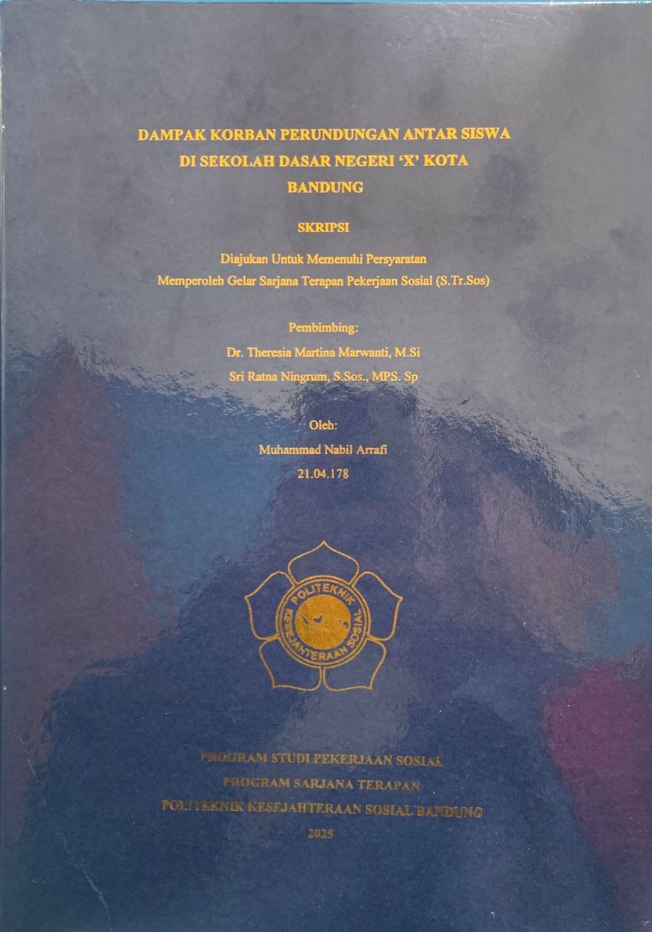 Penelitian ini bertujuan untuk mengkaji dampak yang dialami korban perundungan antar siswa di Sekolah Dasar Negeri (SDN) ‘X’ Kota Bandung. Perundungan yang dimaksud meliputi tiga bentuk utama yaitu verbal, fisik, dan relasional. Penelitian ini menggunakan metode penelitian kualitatif deskriptif dengan teknik pengumpulan data melalui wawancara mendalam, observasi partisipasi, dan studi dokumentasi. Informan dalam penelitian ini ada tujuh yang terdiri dari tiga siswa korban perundungan, dua guru, dua orang tua. Hasil penelitian menunjukkan bahwa perundungan verbal menyebabkan korban merasa terhina, sedih, dan kehilangan rasa percaya diri. Perundungan fisik berdampak pada trauma fisik dan ketakutan untuk bersekolah, sedangkan perundungan relasional mengakibatkan korban dikucilkan, kehilangan teman, dan mengalami tekanan psikologis. Dampak ini memengaruhi proses belajar, penurunan kepercayaan diri, luka secara fisik dan perkembangan anak. Dalam konteks pekerjaan sosial, temuan ini menekankan pentingnya intervensi sosial, perlindungan anak, serta perlunya program pencegahan dan penanganan perundungan di lingkungan sekolah dasar.Berdasarkan temuan mengenai permasalahan perundungan di SDN X ini peneliti merekomendasikan program penyuluhan bernama “Belajar Bersama Membangun Karakteristik Anti Perundungan (BEBASTIPE)” yang bertujuan untuk meningkatkan pengetahuan dan kemampuan siswa terhadap dampak dan pencegahan perundungan serta untuk membangun lingkungan SDN X bersih terhadap terjadinya perundungan. Penelitian ini diharapkan dapat menjadi masukan bagi pekerja sosial, pihak sekolah, korban perundungan dan orang tua dalam mengetahui dampak perundungan verbal, fisik, relasional supaya permasalahan perundungan dapat teratasi.