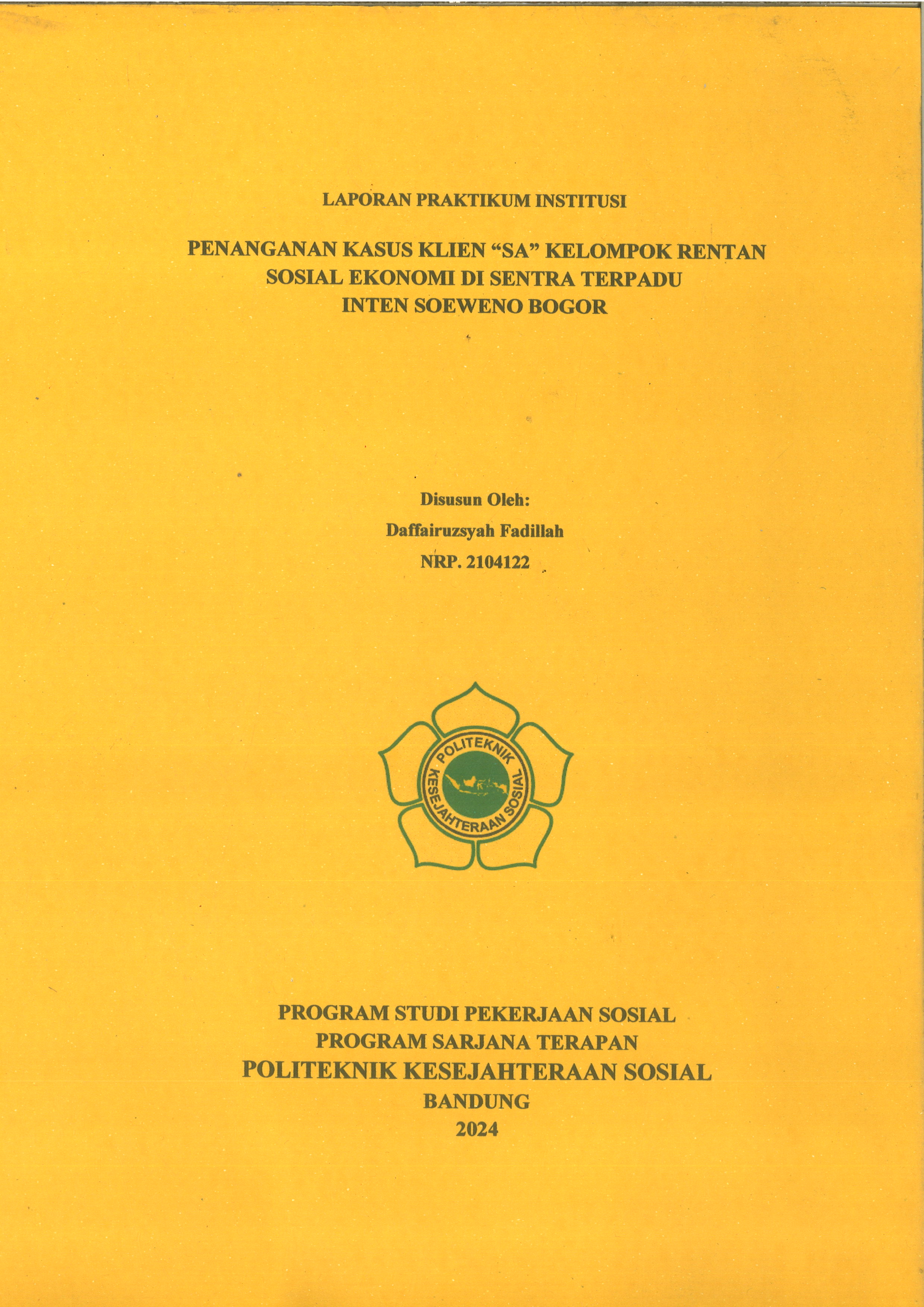LAPORAN PRAKTIKUM INSTITUSI TAHUN 2024 PEKSOS - PENANGANAN KASUS KLIEN “SA” KELOMPOK RENTAN SOSIAL EKONOMI DI SENTRA TERPADU INTEN SOEWENO BOGOR