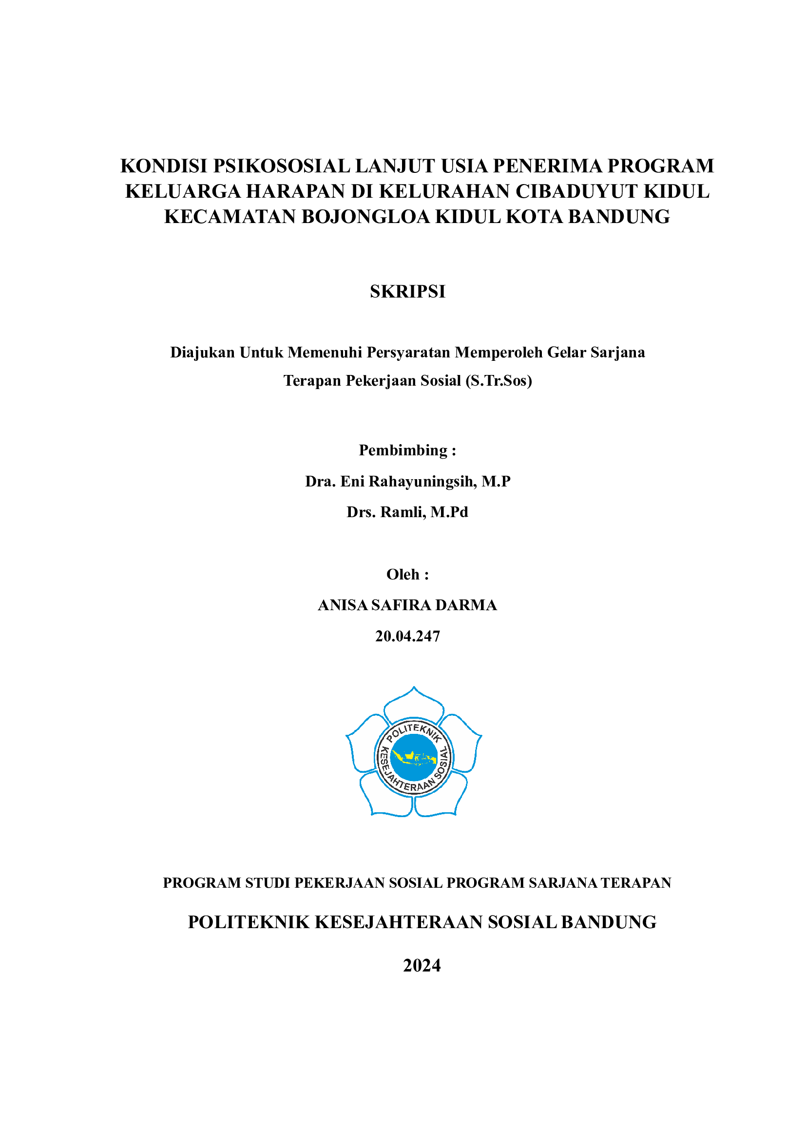 ANISA SAFIRA DARMA, NRP. 20.04.247. Kondisi Psikososial Lanjut Usia Penerima Program Keluarga Harapan Di Kelurahan Cibaduyut Kidul Kecamatan Bojongloa Kidul Kota Bandung,