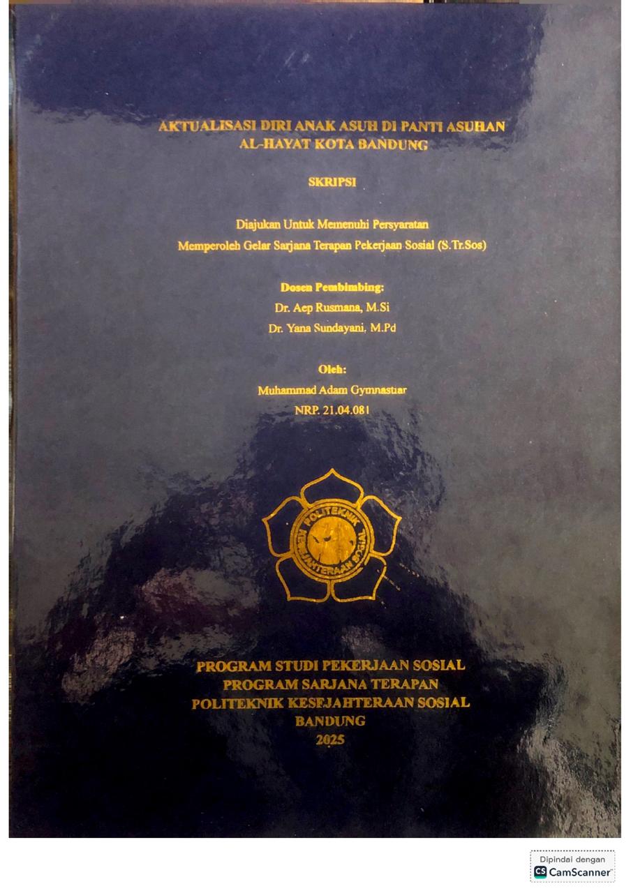 | dc.description.abstract | MUHAMMAD ADAM GYMNASTIAR NRP. 2104081: Aktualisasi Diri Anak Asuh Di Panti Asuhan Al-Hayat Kota Bandung. Dosen Pembimbing: AEP RUSMANA dan YANA SUNDAYANI Aktualisasi diri merupakan tahapan kebutuhan tertinggi dalam kehidupan individu. Penelitian ini bertujuan untuk mendapatkan gambaran empiris mengenai: 1) Karakteristik responden, 2) Aspek Kreativitas, 3) Aspek Moralitas, 4) Aspek Penerimaan Diri, 5) Aspek Spontanitas, dan 6) Aspek Pemecahan Masalah. Pendekatan yang digunakan dalam penelitian ini adalah metode deskriptif. Populasi dalam penelitian ini adalah 30 anak asuh yang berada di panti asuhan Al-Hayat Kota Bandung. Teknik pengambilan sampel dalam penelitian ini menggunakan sensus dengan jumlah sampel 30 anak asuh. Teknik pengumpulan data yang digunakan adalah angket dan studi dokumentasi. Skala pengukuran penelitian ini menggunakan skala Likert. Uji validitas yang digunakan adalah validitas muka (face valdity), dan uji reabilitas menggunakan Alpha Cronbach dengan hasil 0,914 > 0,7 (reliabilitas bagus). Hasil penelitian ini menunjukan anak asuh pada Aspek kreativitas memiliki skor 977 (73,38%) termasuk pada kelas interval sedang, moralitas memiliki skor 715 (79,44%) termasuk pada kelas interval tinggi, penerimaan diri memiliki skor 714 (79,33%) termasuk pada kelas interval tinggi, spontanitas memiliki skor 723 (80,33%) termasuk pada kelas interval tinggi, dan pemecahan masalah memiliki skor 473 (78,82%) dengan kelas interval tinggi. Temuan penelitian ini menunjukan kreativitas memiliki kelas interval sedang hal ini dapat dipengaruhi oleh interaksi dan cara berfikir. Oleh sebab itu, peneliti mengusulkan program BANG MENARI (Bersama Anak Generasi Muda Mencapai Aktualisasi Diri) dengan motode social group work tipe kelompok socialization group di panti asuhan Al-Hayat Kota Bandung. Kata Kunci: Aktualisasi Diri, Anak Asuh, Panti Asuhan Al-Hayat ABSTRACT MUHAMMAD ADAM GYMNASTIAR: Self-Actualisation of Faster Children at Al-Hayat Orphanage, Bandung City. Supervisor: AEP RUSMANA dan YANA SUNDAYANI Self-actualisation constitutes the highest level of human need. This study aims to present empirical evidence on: (1) the characteristics of the respondents; (2) creativity; (3) morality; (4) self-acceptance; (5) spontaneity; and (6) problem solving. A descriptive method was employed. The population consisted of 40 foster children living at Al-Hayat Orphanage in Bandung City, and a census technique yielded a sample of 30 children. Data were gathered through questionnaires and document review, using a Likert scale for measurement. Face validity was applied, and reliability testing with Cronbach’s Alpha produced a coefficient of 0.914 (> 0.70), indicating excellent reliability. The results show among the foster children: the creativity aspect scored 977 (73.38 %), placing it in the moderate category; morality scored 715 (79.44 %), self-acceptance 714 (79.33 %), spontaneity 723 (80.33 %), and problem-solving 473 (78.82 %)—all in the high category. The moderate classification for creativity may stem from patterns of interaction and thought processes. Therefore, the researcher proposes the “BANG MENARI” programme (Bersama Anak Generasi Muda Mencapai Aktualisasi Diri—Together with the Young Generation Achieving Self-Actualisation), implemented through social group work in the form of a socialisation group at Al-Hayat Orphanage, Bandung City. Keywords: self-actualisation, foster children, Orphanage Al-Haya | |