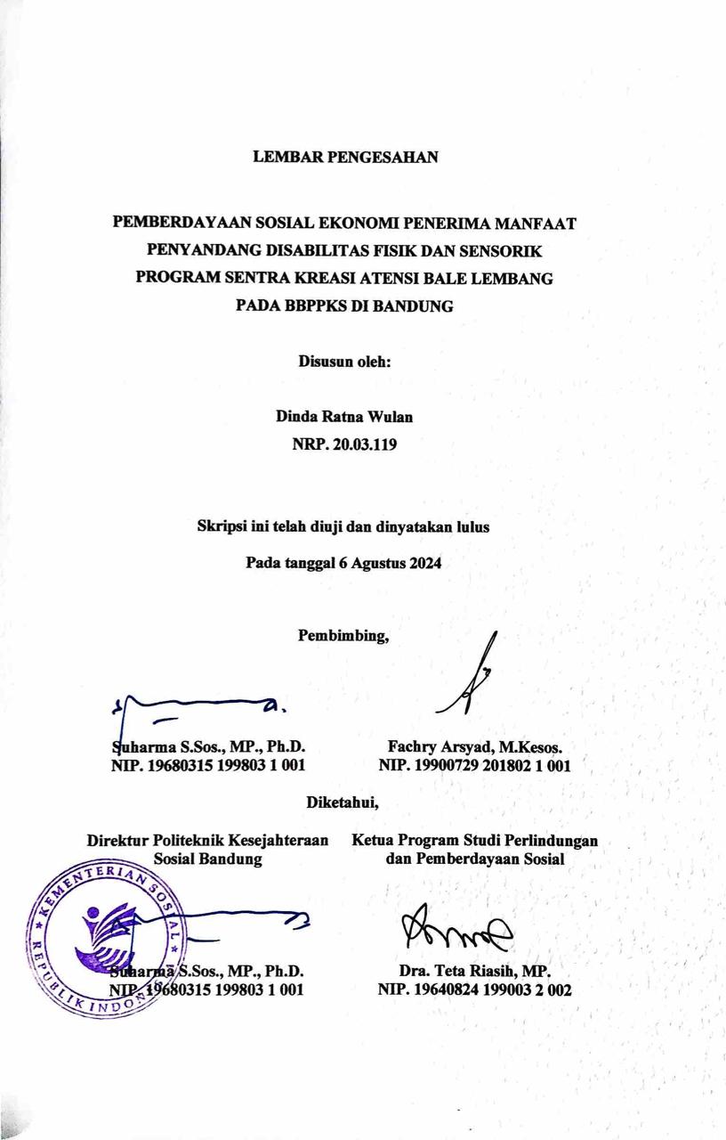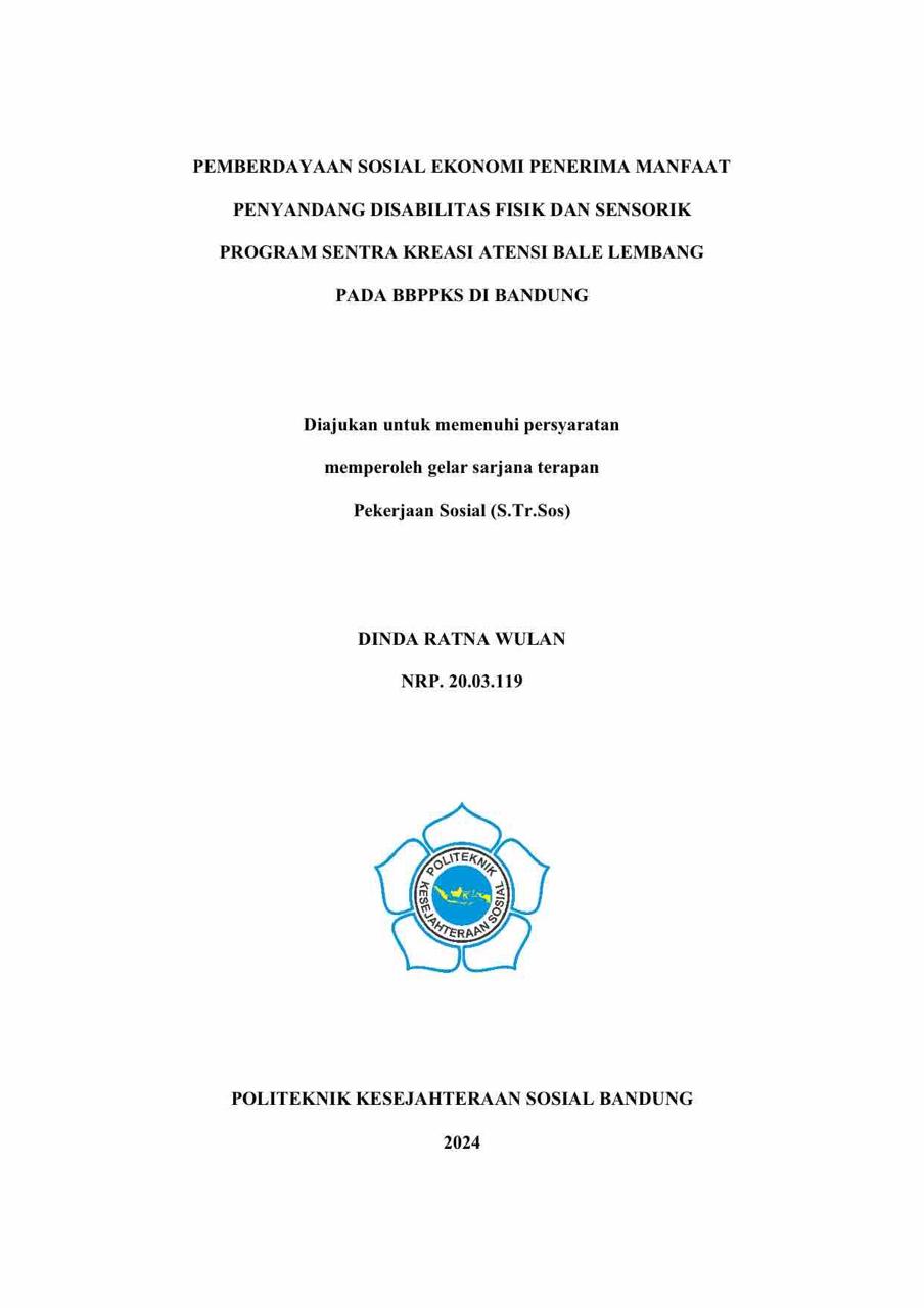 DINDA RATNA WULAN. NRP. 20.03.119. Pemberdayaan Sosial Ekonomi Penerima Manfaat Penyandang Disabilitas Fisik dan Sensorik Program Sentra Kreasi ATENSI Bale Lembang Pada BBPPKS di Bandung.
