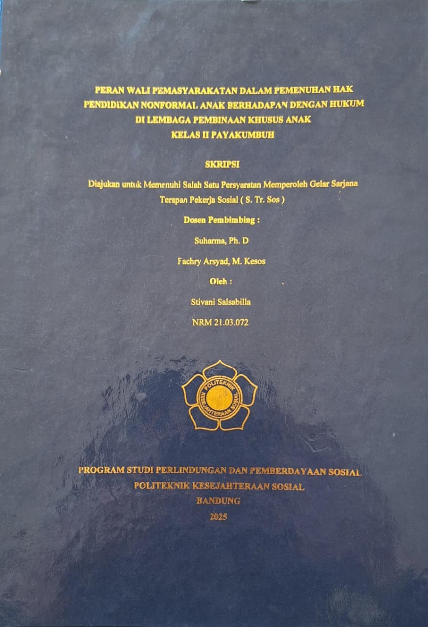 STIVANI SALSABILLA, 21.03.072: Peran Wali Pemasyarakatan Dalam Pemenuhan Hak Pendidikan Non Formal Anak Berhadapan dengan Hukum di Lembaga Pembinaan Khusus Anak Kelas II Payakumbuh, Dosen Pembimbing: SUHARMA dan FACHRY ARSYAD. Penelitian ini bertujuan mengetahui peran Wali Pemasyarakatan dalam pemenuhan hak pendidikan non formal bagi Anak Berhadapan dengan Hukum (ABH) di Lembaga Pembinaan Khusus Anak (LPKA) Kelas II Payakumbuh. Fokus penelitian mencakup gambaran pendidikan non formal di LPKA serta peran Wali Pemasyarakatan sebagai fasilitator, motivator, dan komunikator. Metode penelitian menggunakan pendekatan kualitatif dengan jenis deskriptif. Data diperoleh melalui wawancara mendalam, observasi, dan studi dokumentasi. Informan penelitian terdiri dari tiga Wali Pemasyarakatan dan tiga Anak binaan. Analisis data menggunakan teknik reduksi data, penyajian data, dan penarikan kesimpulan. Hasil penelitian menunjukkan pendidikan non formal di LPKA dilaksanakan melalui program kesetaraan Paket A, B, dan C bekerja sama dengan Pusat Kegiatan Belajar Masyarakat (PKBM). Wali Pemasyarakatan berperan sebagai fasilitator dengan memfasilitasi akses layanan pendidikan dan koordinasi eksternal. Sebagai motivator, wali memberikan dukungan psikologis dan semangat belajar anak binaan. Sebagai komunikator, wali menjembatani komunikasi antara anak, keluarga, dan pihak terkait lainnya. Kendala yang dihadapi meliputi keterbatasan sarana prasarana, minimnya sumber daya manusia, dan belum optimalnya peran wali yang terstruktur. Kesimpulan penelitian menegaskan peran Wali Pemasyarakatan penting dalam mendukung hak pendidikan ABH, namun efektivitasnya dipengaruhi keterbatasan fasilitas dan dukungan kelembagaan. Diperlukan peningkatan sarana pendidikan, pelatihan kompetensi wali, serta penguatan kolaborasi dengan pihak eksternal. Kata kunci: Wali Pemasyarakatan, Pendidikan Non Formal, Anak Berhadapan dengan Hukum