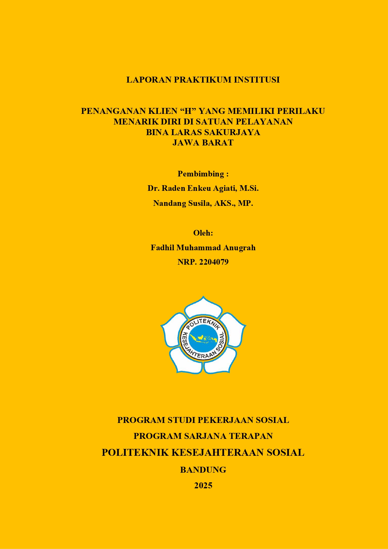 LAPORAN PRAKTIKUM INSTITUSI - PENANGANAN KLIEN “H” YANG MEMILIKI PERILAKU MENARIK DIRI DI SATUAN PELAYANAN BINA LARAS SAKURJAYA JAWA BARAT
