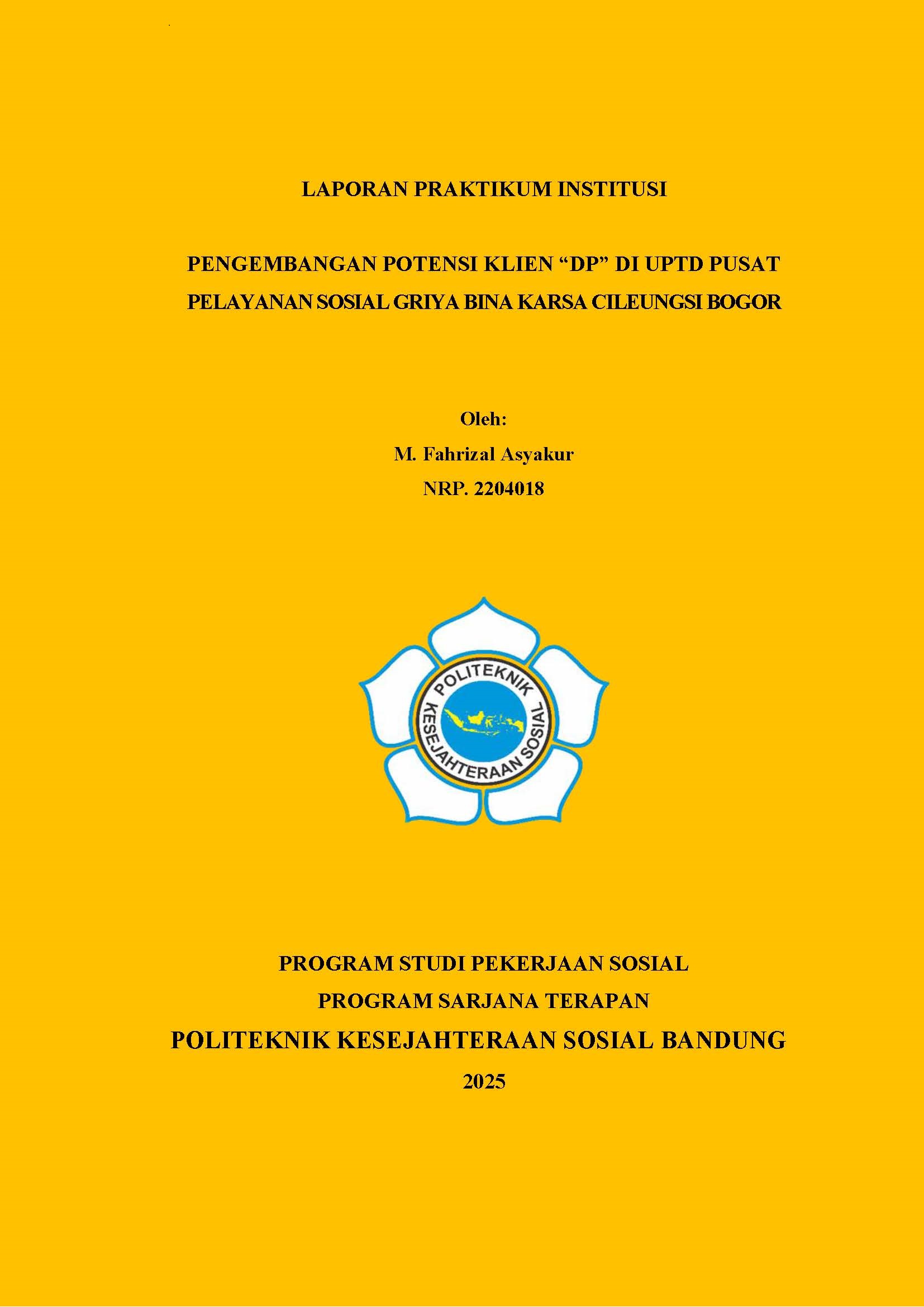 LAPORAN PRAKTIKUM INSTITUSI PENGEMBANGAN POTENSI KLIEN “DP” DI UPTD PUSAT PELAYANAN SOSIAL GRIYA BINA KARSA CILEUNGSI BOGOR