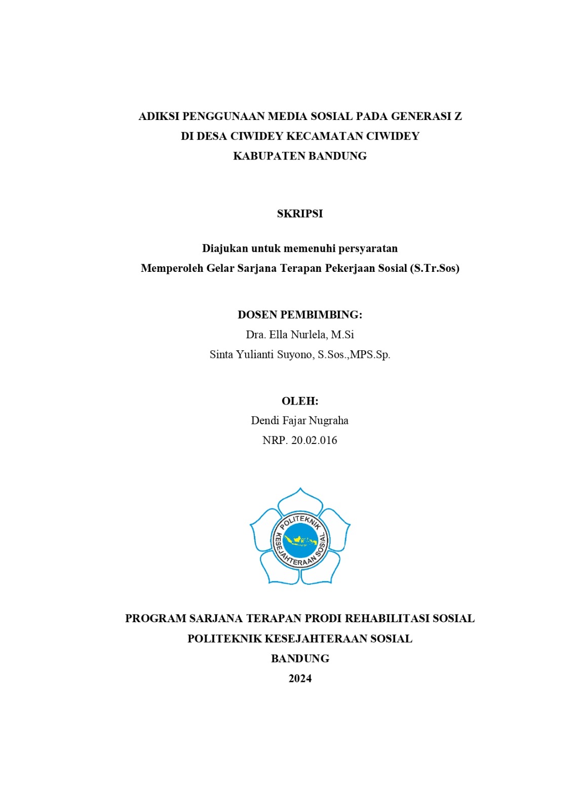 Adiksi Penggunaan Media Sosial Pada Generasi Z di Desa Ciwidey Kecamatan Ciwidey Kabupaten Bandung, Skripsi, Program Studi Rehabilitasi Sosial, Politeknik Kesejahteraan Sosial Bandung.