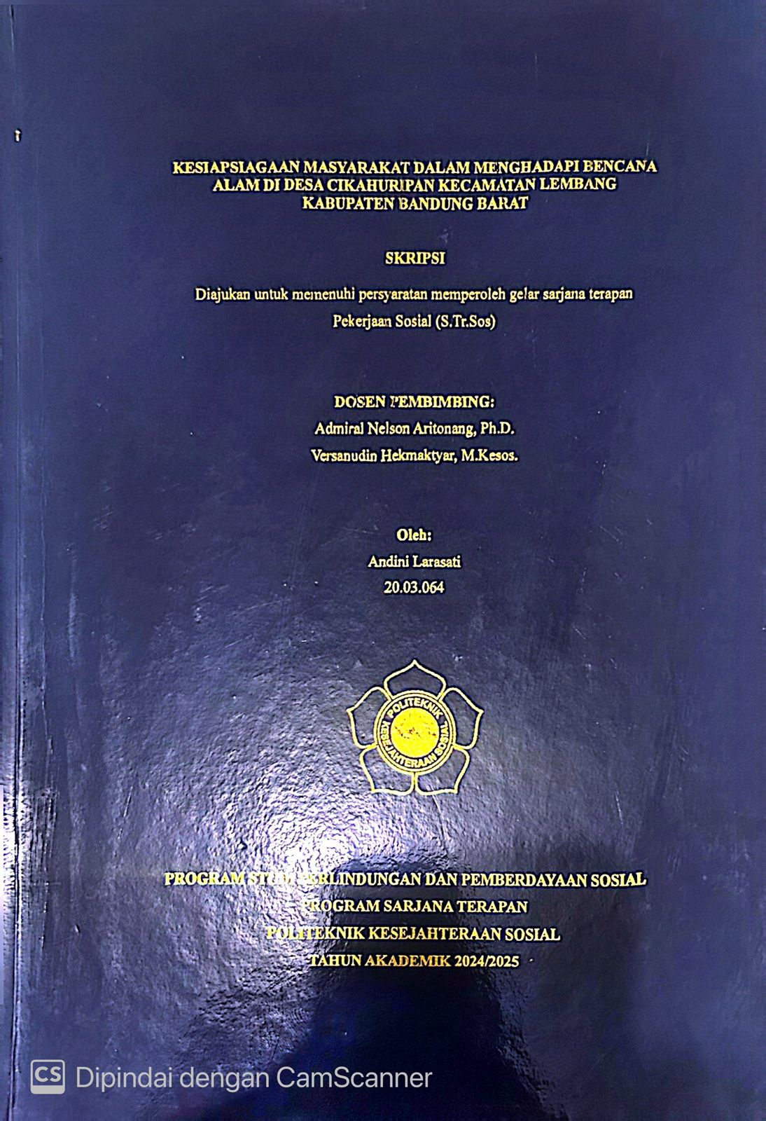 Andini Larasati, NRM. 20.03.064. Kesiapsiagaan Masyarakat Dalam Menghadapi Bencana Alam Di Desa Cikahuripan Kecamatan Lembang Kabupaten Bandung Barat, Dibimbing oleh ADMIRAL NELSON ARITONANG dan VERSANUDIN HEKMAKTYAR Penelitian ini bertujuan untuk mengetahui tingkat kesiapsiagaan masyarakat Desa Cikahuripan, Kecamatan Lembang, Kabupaten Bandung Barat, dalam menghadapi 4 jenis ancaman bencana alam. Penelitian menggunakan pendekatan kuantitatif deskriptif dengan instrumen LIPI DAN UNESCO (2006)yang mencakup empat parameter: pengetahuan risiko bencana, rencana tanggap darurat, sistem peringatan dini, dan mobilisasi sumber daya. Sebanyak 98 responden dari seluruh RW di Desa Cikahuripan menjadi sampel penelitian. Hasil menunjukkan bahwa Indeks Kesiapsiagaan Masyarakat (IKM) secara keseluruhan adalah 74,2 yang tergolong dalam kategori “Siap”. Parameter dengan skor tertinggi adalah pengetahuan risiko bencana (83,15), disusul rencana tanggap darurat (76,4), sistem peringatan (67), dan mobilisasi sumber daya (46,5) sebagai parameter terendah. Rendahnya nilai mobilisasi sumber daya menunjukkan lemahnya kapasitas masyarakat dalam mengorganisasi logistik, dana darurat, dan perlindungan aset saat bencana. Berdasarkan temuan ini, peneliti merancang program intervensi berbasis komunitas bernama “SIAGA CIKAHURIPAN”, yang berfokus pada pelatihan dan simulasi kebencanaan untuk meningkatkan kemampuan mobilisasi sumber daya. Program dirancang secara partisipatif dengan melibatkan pemerintah desa, lembaga masyarakat, perempuan, dan pemuda. Hasil penelitian ini diharapkan menjadi rujukan dalam penyusunan kebijakan kesiapsiagaan dan pengembangan program berbasis masyarakat di wilayah rawan bencana. Kata kunci: kesiapsiagaan bencana alam, indeks kesiapsiagaan, mobilisasi sumberdaya