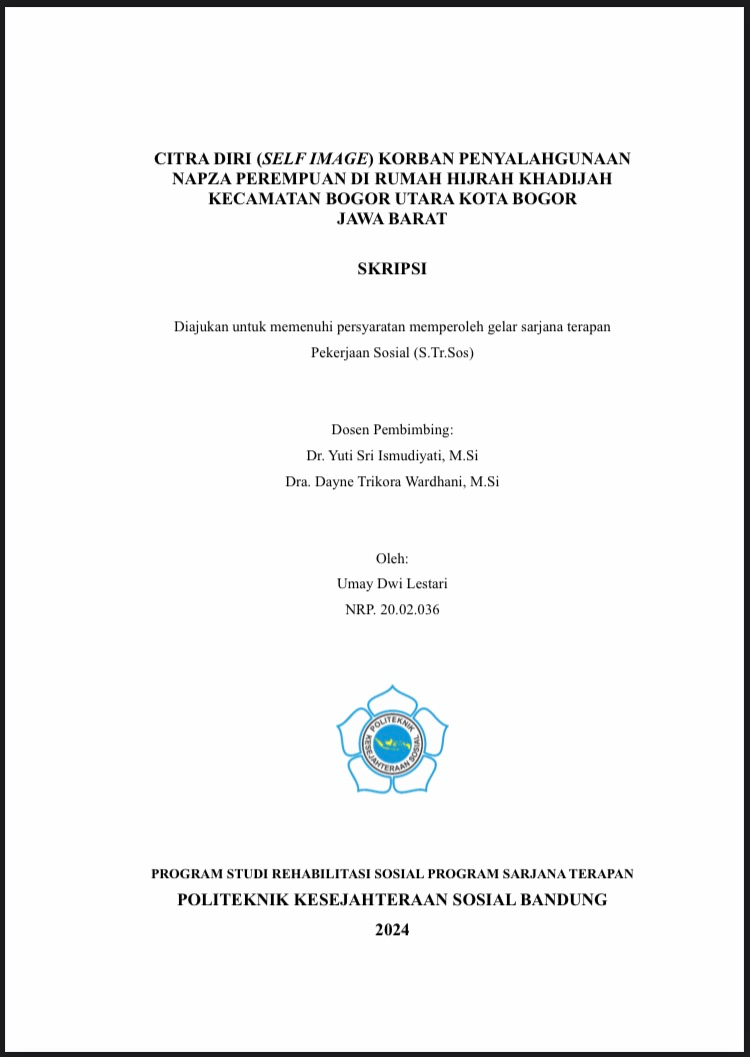 Penelitian tentang Citra Diri (Self Image) Korban Penyalahgunaan NAPZA Perempuan di Rumah Hijrah Khadijah Kecamatan Bogor Utara Kota Bogor Jawa Barat bertujuan untuk memperoleh gambaran mengenai: 1. Karakteristik Informan, 2. Gambaran yang dimiliki seseorang mengenai penampilan dirinya, terutama fisik dan ekspresi yang diberikan pada orang lain (Perceptual Component), 3. Gambaran tentang karakteristik dalam diri seseorang yang meliputi tentang kelebihan dan kekurangan yang dimiliki oleh individu, kemampuan diri serta keterbatasan yang dimiliki oleh individu (Conceptual Component), 4. Pemikiran serta perasaan seseorang mengenai dirinya, status dan pandangan terhadap individu lain (Attitudional Component). Metode penelitian yang digunakan adalah deskriptif kualitatif dengan 4 (empat) informan yang dibedakan menjadi Korban Penyalahgunaan NAPZA Perempuan, Pekerja Sosial dan Konselor Adiksi di Rumah Hijrah Khadijah Bogor. Data dikumpulkan melalui teknik kualitatif deskriptif yaitu wawancara mendalam, observasi dan studi dokumentasi. Analisa data dilakukan dengan pengumpulan data, reduksi data, penyajian data, penarikan kesimpulan dan verifikasi data. Hasil penelitian menunjukan bahwa Citra Diri (Self Image) Korban Penyalahgunaan NAPZA Perempuan di Rrumah Hijrah Khadijah Kecamatan Bogor Utara Kota Bogor Jawa Barat mengalami rasa malu dan rendah diri terhadap perubahan yang terjadi pada fisiknya, merasa bersalah dan tidak puas terhadap peran sosialnya, dan kurangnya penerimaan keluarga. Hal tersebut sangat mempengaruhi serta memperburuk citra diri korban penyalahgunaan NAPZA Perempuan di Rumah Hijrah Khadijah Bogor. Berdasarkan hal ini, program yang diusulkan sesuai dengan hasil penelitian adalah “Peningkatan Citra Diri Bagi Perempuan Korban Penyalahgunaan NAPZA melalui Konseling.