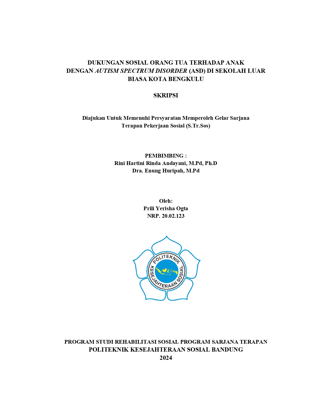 PRILI YERISHA OGTA, NRP.20.02.123. Dukungan Sosial Orang Tua terhadap Anak dengan Autism Spectrum Disorder di Sekolah Luar Biasa Kota Bengkulu.