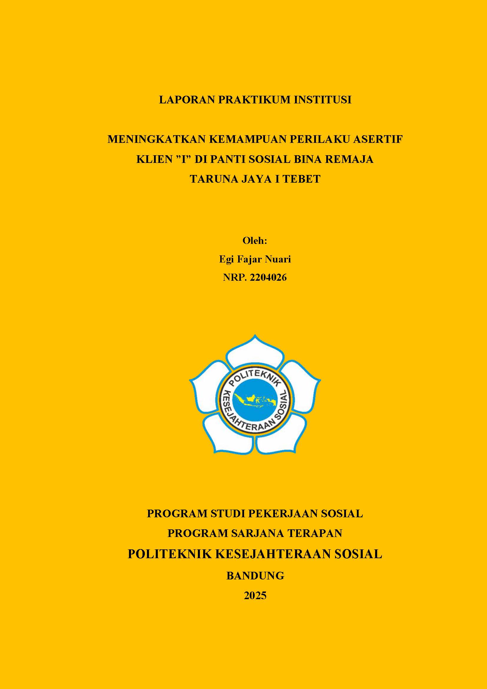 LAPORAN PRAKTIKUM INSTITUSI - MENINGKATKAN KEMAMPUAN PERILAKU ASERTIF KLIEN “I” DI PANTI SOSIAL BINA REMAJA TARUNA JAYA 1 TEBET