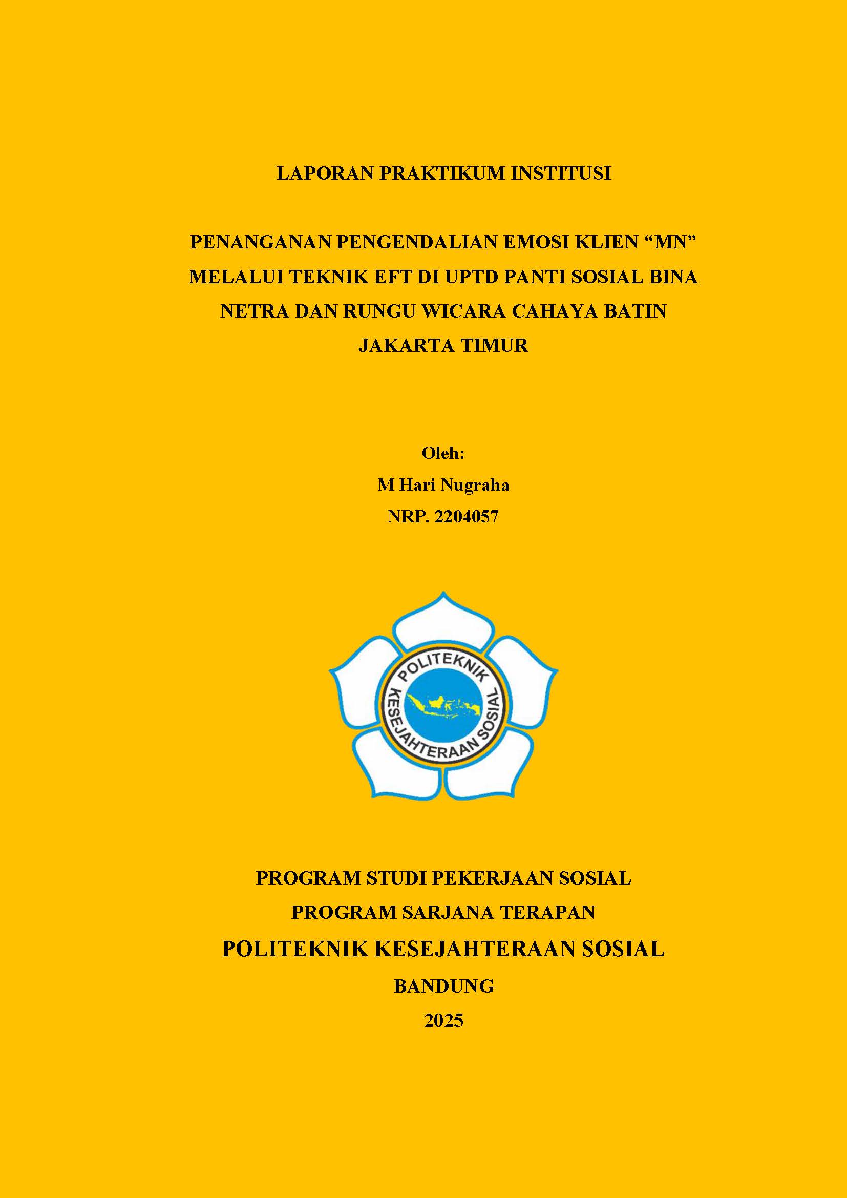 LAPORAN PRAKTIKUM INSTITUSI PENANGANAN PENGENDALIAN EMOSI KLIEN “MN” MELALUI TEKNIK EFT DI UPTD PANTI SOSIAL BINA NETRA DAN RUNGU WICARA CAHAYA BATIN JAKARTA TIMUR