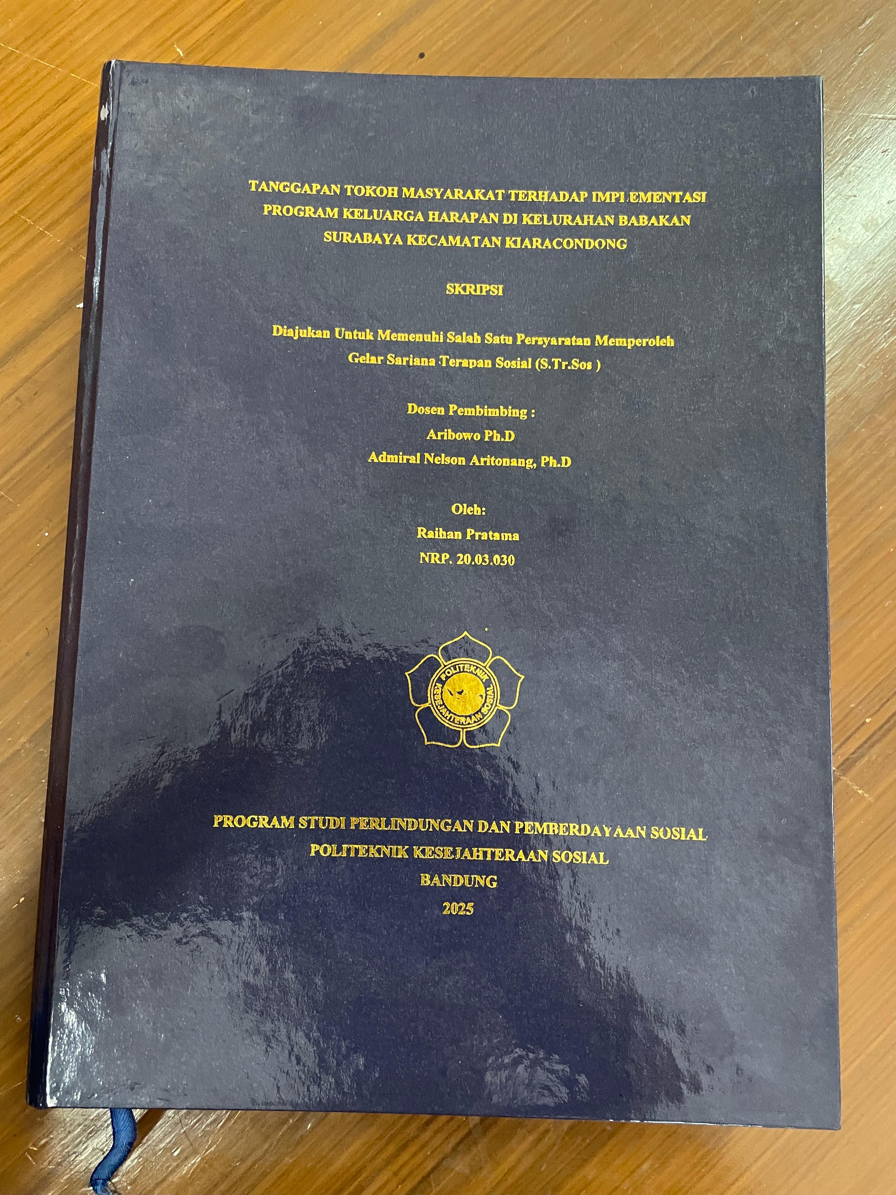 RAIHAN PRATAMA, NRP. 20.03.030. TANGGAPAN TOKOH MASYARAKAT TERHADAP IMPLEMENTASI PROGRAM KELUARGA HARAPAN DI KELURAHAN BABAKAN SURABAYA KECAMATAN KIARACONDONG. DOSEN PEMBIMBING: ARIBOWO dan ADMIRAL NELSON ARITONANG