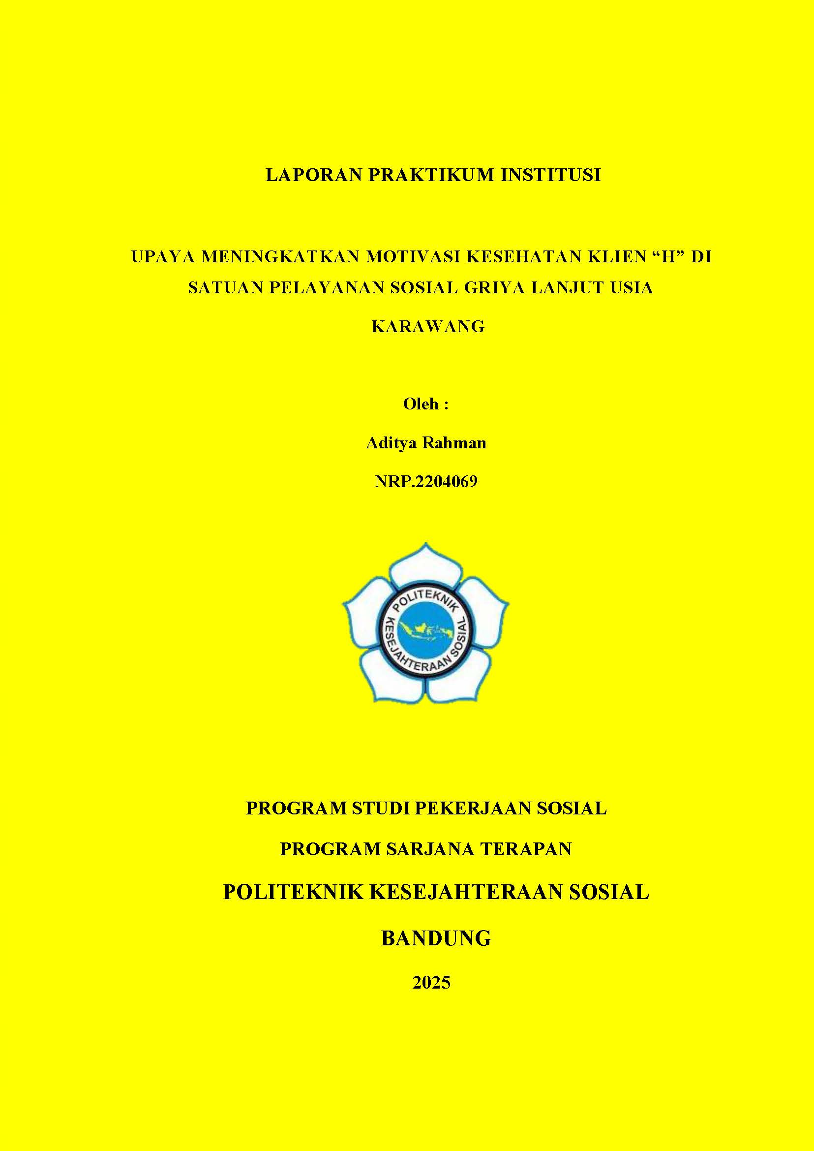 LAPORAN PRAKTIKUM INSTITUSI - UPAYA MENINGKATKAN MOTIVASI KESEHATAN KLIEN “H” DI SATUAN PELAYANAN SOSIAL GRIYA LANJUT USIA KARAWANG