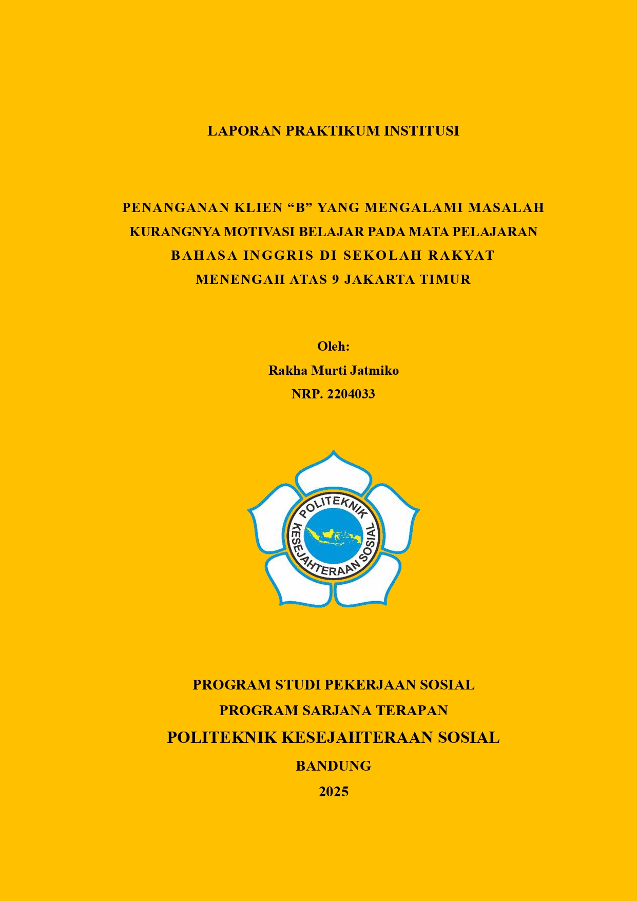 LAPORAN PRAKTIKUM INSTITUSI PENANGANAN KLIEN “B” YANG MENGALAMI MASALAH KURANGNYA MOTIVASI BELAJAR PADA MATA PELAJARAN BAHASA INGGRIS DI SEKOLAH RAKYAT MENENGAH ATAS 9 JAKARTA TIMUR