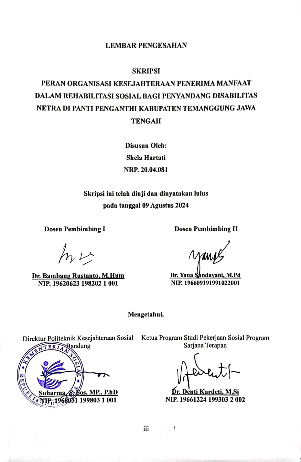 SHELA HARTATI, NRP. 20.04.081. Peran Organisasi Kesejahteraan Penerima Manfaat Dalam Rehabilitasi Sosial Bagi Penyandang Disabilitas Netra Di Panti Penganthi Kabupaten Temanggung. Dosen Pembimbing: Bambang Rustanto dan Yana Sundayani. Peran organisasi penyandang disabilitas merupakan upaya untuk mewujudkan inklusi sosial di masyarakat untuk membuktikan bahwa penyandang disabilitas bekerja mengelola dalam memastikan hak-hak serta kebutuhan para penyandang disabilitas dapat terkomodasi dengan baik yang beragam situasi. Penelitian ini bertujuan untuk mengkaji lebih mendalam tentang peran Organisasi Kesejahteraan Penerima Manfaat (OKPM) dalam membantu proses rehabilitasi sosial bagi penyandang disabilitas netra di Panti Pelayanan Sosial Disabilitas Sensorik Netra (PPSDSN) Penganthi Kabupaten Temanggung, Jawa Tengah. Metode yang digunakan dalam penelitian ini adalah pendekatan kualitatif. Informan dalam penelitian ini berjumlah 8 orang informan yaitu pegawai panti, penyandang disabilitas netra dan pengurus Organisasi Kesejahteraan Penerima Manfaat (OKPM). Teknik pengumpulan data yang digunakan yaitu wawancara mendalam, observasi dan studi dokumentasi. Hasil penelitian yang dilakukan peneliti menunjukkan diperoleh beberapa masalah yang dihadapi peserta bahwa : 1) partisipasi penerima manfaat rendah akan kegiatan dipanti; 2) seksi-seksi OKPM masih rendah; 3) kurangnya motivasi dari penerima manfaat dipanti. Berdasarkan hasil penelitian tersebut, peneliti mengusulkan program yaitu “Peningkatan Partisipasi dan Motivasi Penerima Manfaat dalam Mengikuti Kegiatan yang Diselenggarakan oleh OKPM di Panti Penganthi Temanggung”. Tujuan dari program ini yaitu untuk meningkatkan partisipasi dan motivasi dari para penerima manfaat di panti agar mereka antusias dan rajin dalam mengikuti semua kegiatan yang diselenggarakan oleh OKPM di Panti Penganthi Temanggung. Kata Kunci: Peran Organisasi Kesejahteraan Penerima Manfaat (OKPM), Rehabilitasi Sosial, Penyandang Disabilitas Netra, Panti Penganthi Temanggung ABSTRACT SHELA HARTATI, NRP. 20.04.081. The Role of Beneficiary Welfare Organization in Social Rehabilitation for Persons with Visual Disabilities at Panti Penganthi Temanggung Regency. Supervisors: Bambang Rustanto and Yana Sundayani. The role of disabled people's organizations is an effort to realize social inclusion in society to prove that people with disabilities work to manage in ensuring that the rights and needs of people with disabilities can be accommodated properly in various situations. This study aims to examine more deeply the role of the Beneficiary Welfare Organization (OKPM) in assisting the social rehabilitation process for people with visual disabilities at the Penganthi Sensory Net Disability Social Service Center (PPSDSN) Temanggung Regency, Central Java. The method used in this research is a qualitative approach. There were 8 informants in this study, namely orphanage employees, persons with visual disabilities and administrators of the Beneficiary Welfare Organization (OKPM). The data collection techniques used were in-depth interviews, observation and documentation studies. The results of the research conducted by the researcher show that there are several problems faced by participants that: 1) low beneficiary participation in activities at the institution; 2) OKPM sections are still low; 3) lack of motivation from beneficiaries at the orphanage. Based on the results of this study, the researcher proposed a program, namely "Increasing Beneficiary Participation and Motivation in Participating in Activities Organized by OKPM at Penganthi Temanggung Nursing Home". The purpose of this program is to increase the participation and motivation of the beneficiaries at the orphanage so that they are enthusiastic and diligent in participating in all activities organized by OKPM at Penganthi Temanggung Orphanage. Keywords: Role of Beneficiary Welfare Organization (OKPM), Social Rehabilitation, Persons with Visual Disabilities, Penganthi Temanggung Nursing Home