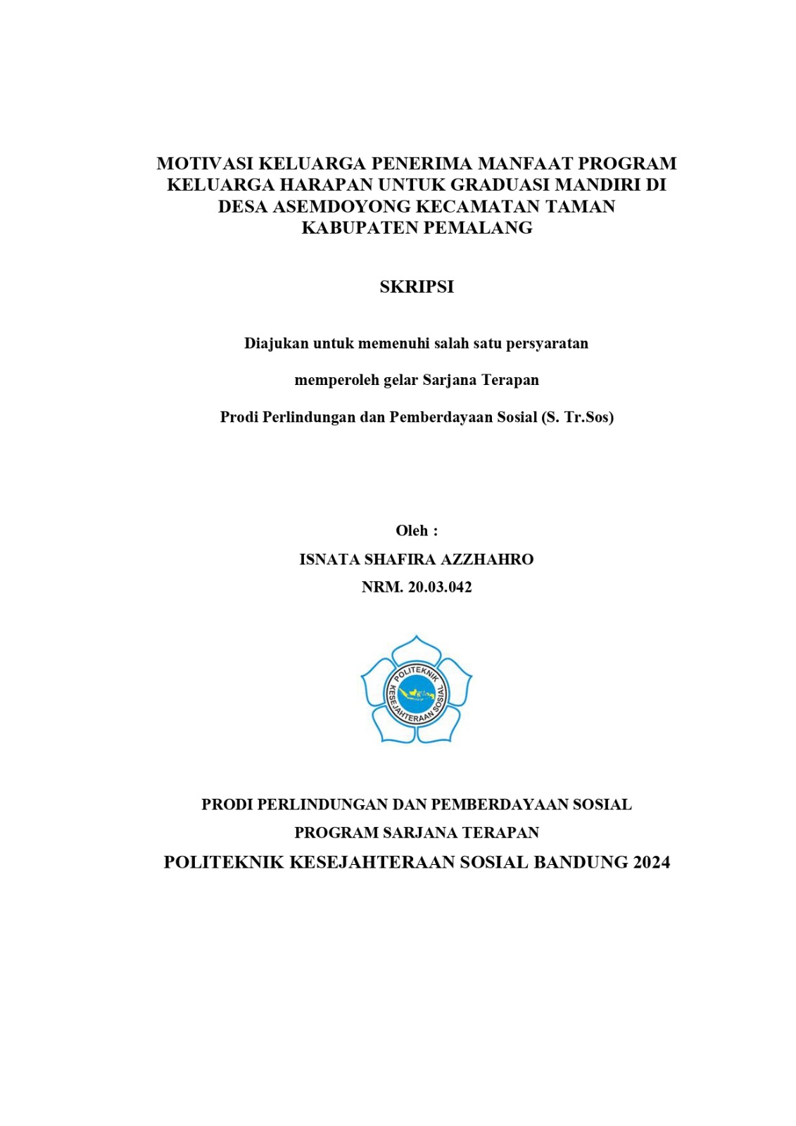 ABSTRAK ISNATA SHAFIRA AZZHAHRO, 20.03.042, Motivasi Keluarga Penerima Manfaat Program Keluarga Harapan untuk Graduasi Mandiri Di Desa Asemdoyong Kecamatan Taman Kabupaten Pemalang. Dibimbing Oleh DECKY IRIANTI, M.P dan VERSANUDIN HEKMATYAR, S.KPm, M.Kesos PKH bertujuan untuk memutus rantai kemiskinan antar generasi. sehingga pembangunan suatu negara terus menuju kearah yang lebih baik. Graduasi Mandiri merupakan indikator keberhasilan PKH. Banyak faktor yang mempengaruhi keberhasilan graduasi mandiri salah satunya motivasi. Namun pada penelitian ini motivasi KPM PKH masih rendah. Mereka beralasan bahwa faktor ekonomi yang membuat mereka merasa masih layak untuk mendapatkan PKH karena tidak mampu membiayai kehidupan masa mendatang, dan mentalitas miskin yang membuat mereka sangat bergantung pada penerimaan bantuan PKH, Bahkan mereka merasa masih memenuhi syarat dan kepesertaan sebagai penerima PKH, Terdapat juga KPM yang setiap tahunnya kurang lebih hampir 5 tahun selalu ikut mendapatkan bantuan PKH padahal sudah dipandang mampu untuk graduasi mandiri dan seharusnya berganti pada KPM PKH lain yang lebih membutuhkan. Penelitian ini bertujuan untuk mengetahui bagaimana motivasi KPM PKH untuk graduasi mandiri di Desa Asemdoyong Kecamatan Taman Kabupaten Pemalang. Metode penelitian yang digunakan adalah penelitian kuantitatif dengan pendekatan deskriptif korelatif. Sumber data yang digunakan dalam penelitian ini adalah sumber data primer. Teknik pengambilan sampel menggunakan simple random sampling. Teknik pengumpulan data menggunakan kuesioner. Analisis data menggunakan uji Chi Square. Hasil dari penelitian ini bahwa aspek motivasi keinginan mandiri, pengembangan diri dan kreatif inovatid untuk pengambilan keputusan untuk graduasi mandiri pada KPM PKH masih cenderung rendah di Desa Asemdoyong Kecamatan Taman Kabupaten Pemalang. Program yang di usulkan adalah Program Peningkatan Motivasi KPM PKH untuk Graduasi Mandiri. Kata Kunci : motivasi, graduasi mandiri, PKH ABSTRACT ISNATA SHAFIRA AZZHAHRO, 20.03.042, Motivation of Family Hope Program (PKH) for Independent Graduation in Asemdoyong Village, Taman District, Pemalang Regency. Supervised by Dr. DECKY IRIANTI, M.P dan VERSANUDIN HEKMATYAR, S.KPm, M.Social Affairs PKH aims to break the chain of poverty between generations. so that the development of a country continues to move towards a better direction. Independent Graduation is an indicator of the success of PKH. Many factors affect the success of independent graduation, one of which is motivation. However, in this study, the motivation of KPM PKH is still low, they reasoned that economic factors that make them feel that they are still worthy of getting PKH because they are unable to finance their future life, and the poor mentality that makes them very dependent on receiving PKH assistance, Even they feel that they still meet the requirements and membership as PKH recipients, There is also the KPK which every year for approximately almost 5 years always participates in getting PKH assistance even though they have seen able to graduate independently and should be replaced by other KPM PKH who are more in need.. The data source used in this study is the primary data source. The sampling technique uses simple random sampling. The data collection technique uses a questionnaire. Data analysis uses the Chi Square test. The results of this study show that the motivational aspects of independent desire, self-development and innovative creativity for decision-making for independent graduation at KPM PKH still tend to be low in Asemdoyong Village, Taman District, Pemalang Regency. The proposed program is the KPM PKH Motivation Improvement Program for Independent Graduation. Keywords : motivation, independent graduation, PKH