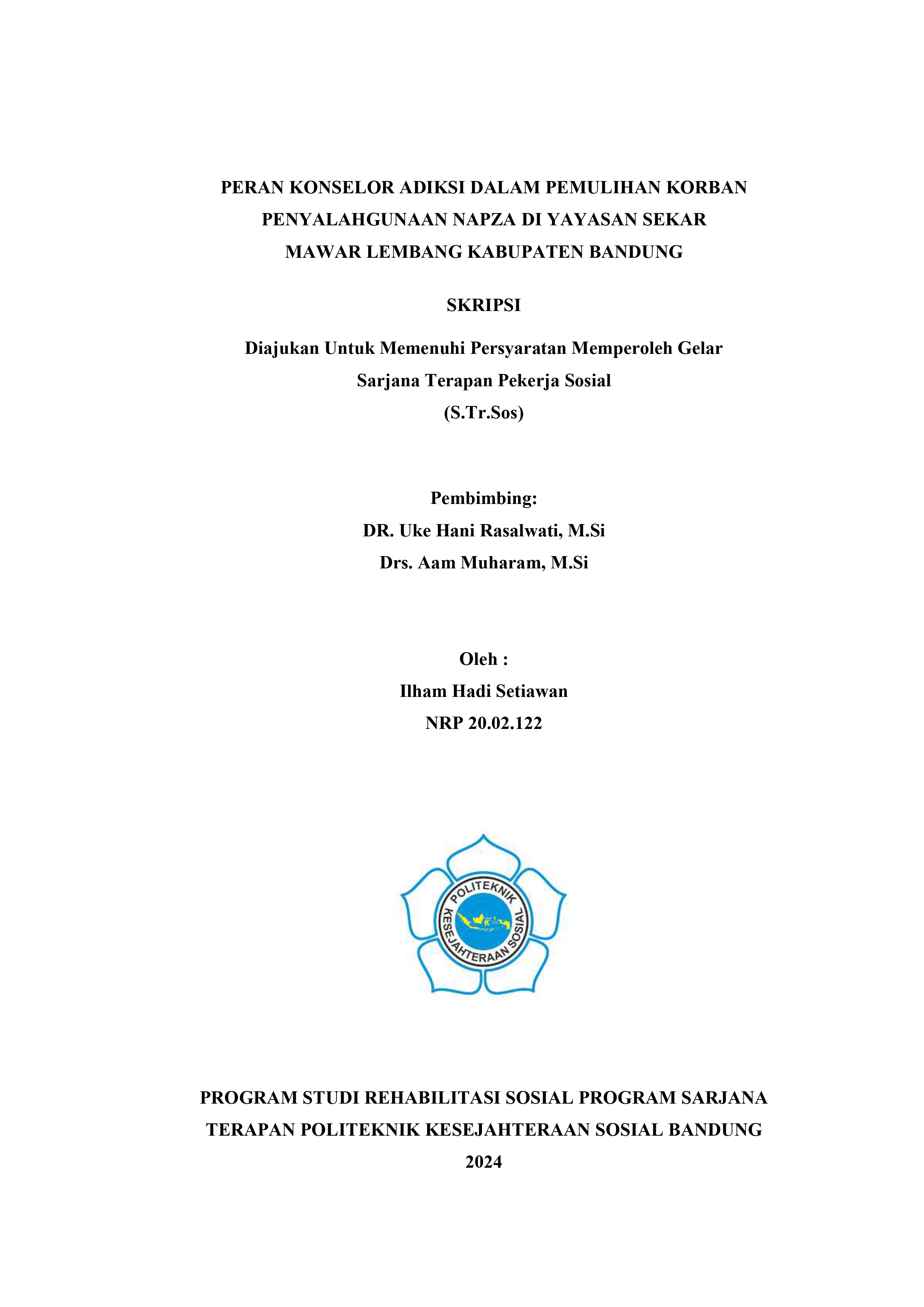 Peran Konselor Dalam Pemulihan Korban Penyalahgunaan Napza di Yayasan Sekar Mawar Lembang Kabupaten Bandung, Skripsi, Program Pendidikan Sarjan Terapan Pekerjaan Sosial, 2024,