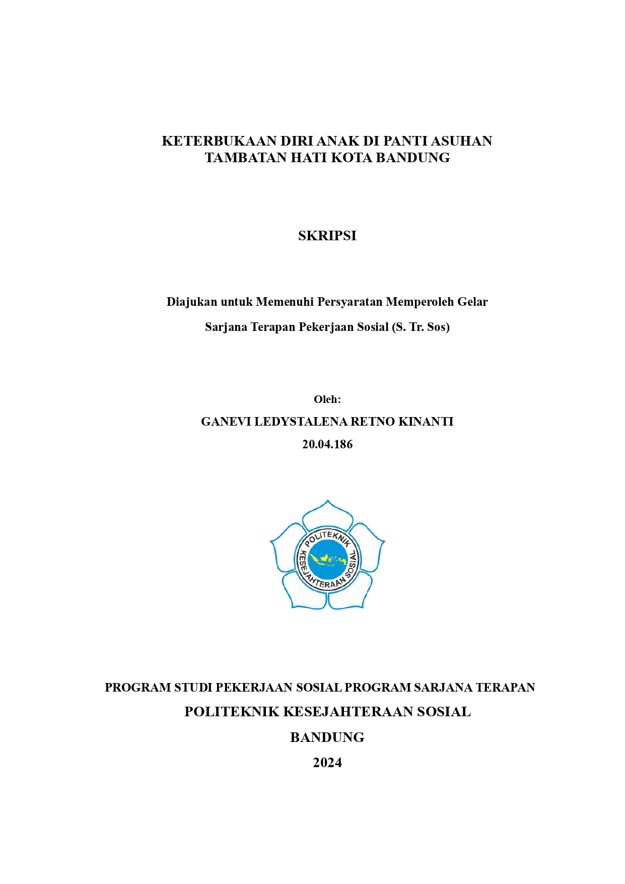 | dc.description.abstract | GANEVI LEDYSTALENA RETNO KINANTI, NRP. 20.04.186. Keterbukaan Diri Anak di Panti Asuhan Tambatan Hati Kota Bandung, Dibimbing oleh Pribowo dan Wiwit Widiansyah. Penelitian ini dilakukan di Panti Asuhan Tambatan Hati Kota Bandung dengan tujuan untuk untuk mengkaji dan memperoleh gambaran empiris tentang keterbukaan diri anak di Panti Asuhan Tambatan Hati Kota Bandung yang dikaji melalui aspek tujuan, ukuran, valensi, kecermatan dan kejujuran serta keakraban. Metode yang digunakan dalam penelitian ini adalah survei dengan pendekatan kuantitatif. Sumber data primer penelitian ini yaitu data yang diperoleh peneliti melalui kuesioner, sedangkan sumber data sekunder penelitian ini diperoleh melalui studi dokumentasi serta dokumen lain yang relevan dengan topik penelitian. Populasi dari penelitian ini yaitu seluruh anak asuh yang tinggal di dalam Panti Asuhan Tambatan Hati Kota Bandung sebanyak 25 anak. Pengambilan sampel menggunakan teknik sampling jenuh. Alat ukur yang digunakan dalam penelitian ini yaitu rating scale. Uji validitas pada penelitian ini menggunakan uji validitas permukaan (face validity) dan uji validitas isi (content validity). Hasil uji reliabilitas dilakukan kepada 30 responden yang dihitung dengan menggunakan rumus Cronbach’s Alpha dengan bantuan SPSS versi 27 dengan hasil skor reliabilitas sebesar 0,816. Hasil penelitian menunjukkan bahwa keterbukaan diri anak di Panti Asuhan Tambatan Hati Kota Bandung berada pada kategori sedang dengan skor aktual sebesar 1.893 dari skor ideal 3.000. Hasil penelitian tersebut menunjukkan bahwa perlu adanya peningkatan keterbukaan diri anak di Panti Asuhan Tambatan Hati Kota Bandung sebagai upaya untuk meningkatkan komunikasi interpersonal anak di Panti Asuhan Tambatan Hati Kota Bandung. Berdasarkan hasil penelitian tersebut, peneliti merancang program yaitu program Memikat Hati dengan menggunakan metode Social Group Work. Kata Kunci: Keterbukaan Diri, Anak, Panti Asuhan ABSTRACT GANEVI LEDYSTALENA RETNO KINANTI, NRP. 20.04.186. Self-Disclosure of Children at the Tambatan Hati Orphanage Bandung City, Supervised by Pribowo and Wiwit Widiansyah. This research was conducted at the Tambatan Hati Orphanage, Bandung City with the aim of studying and obtaining an empirical picture of children's selfdisclosure Tambatan Hati Orphanage in Bandung City, which was studied through the aspects of purpose, size, valence, accuracy and honesty and closeness. The method used in this research is a survey with a quantitative approach. The primary data source for this research is data obtained by researchers through questionnaires, while the secondary data source for this research is obtained through documentation studies and other documents relevant to the research topic. The population of this research was all 25 foster children living in the Tambatan Hati Orphanage in Bandung City. Sampling used a saturated sampling technique. The measuring instrument used in this research is rating scale. The validity test in this research used face validity and content validity. The results of the reliability test were carried out on 30 respondents which were calculated using the Cronbach's Alpha formula with the help of SPSS version 27 with a reliability score of 0.816. The results of the research show that children's self-disclosure at the Tambatan Hati Orphanage in Bandung City is in the medium category with an actual score of 1,893 from an ideal score of 3,000. The results of this research indicate that there is a need to increase children's self-disclosure at the Bandung City Tambatan Hati Orphanage as an effort to improve children's interpersonal communication at the Bandung City Tambatan Hati Orphanage. Based on the results of this research, the researchers designed a program, namely Memikat Hati program, using the method Social Group Work. Keywords: Self-Disclosure, Children, Orphanage | |