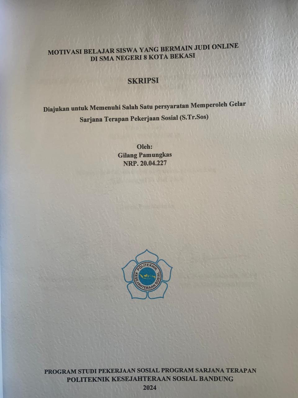 GILANG PAMUNGKAS, NRP. 20.04.227. Motivasi Belajar Siswa Yang Bermain Judi Online di SMA Negeri 8 Kota Bekasi, Karya Ilmiah Akhir Program Sarjana Terapan Sosial, Juli 2024,