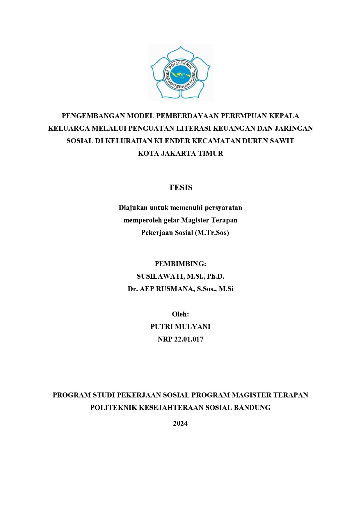 PUTRI MULYANI. 22.01.017. Pengembangan Model Pemberdayaan Perempuan Kepala Keluarga Melalui Penguatan Literasi Keuangan dan Jaringan Sosial.