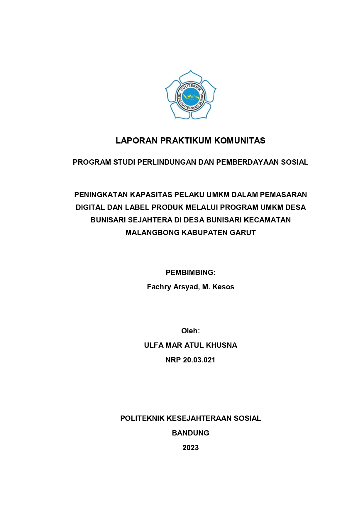LAPORAN PRAKTIKUM KOMUNITAS - PENINGKATAN KAPASITAS PELAKU UMKM DALAM PEMASARAN DlGITAL DAN LABEL PRODUK MELALUI PROGRAM UMKM DESA BUNISARI SEJAHTERA DI DESA BUNISARI KECAMATAN MALANGBONG KABUPATEN GARUT
