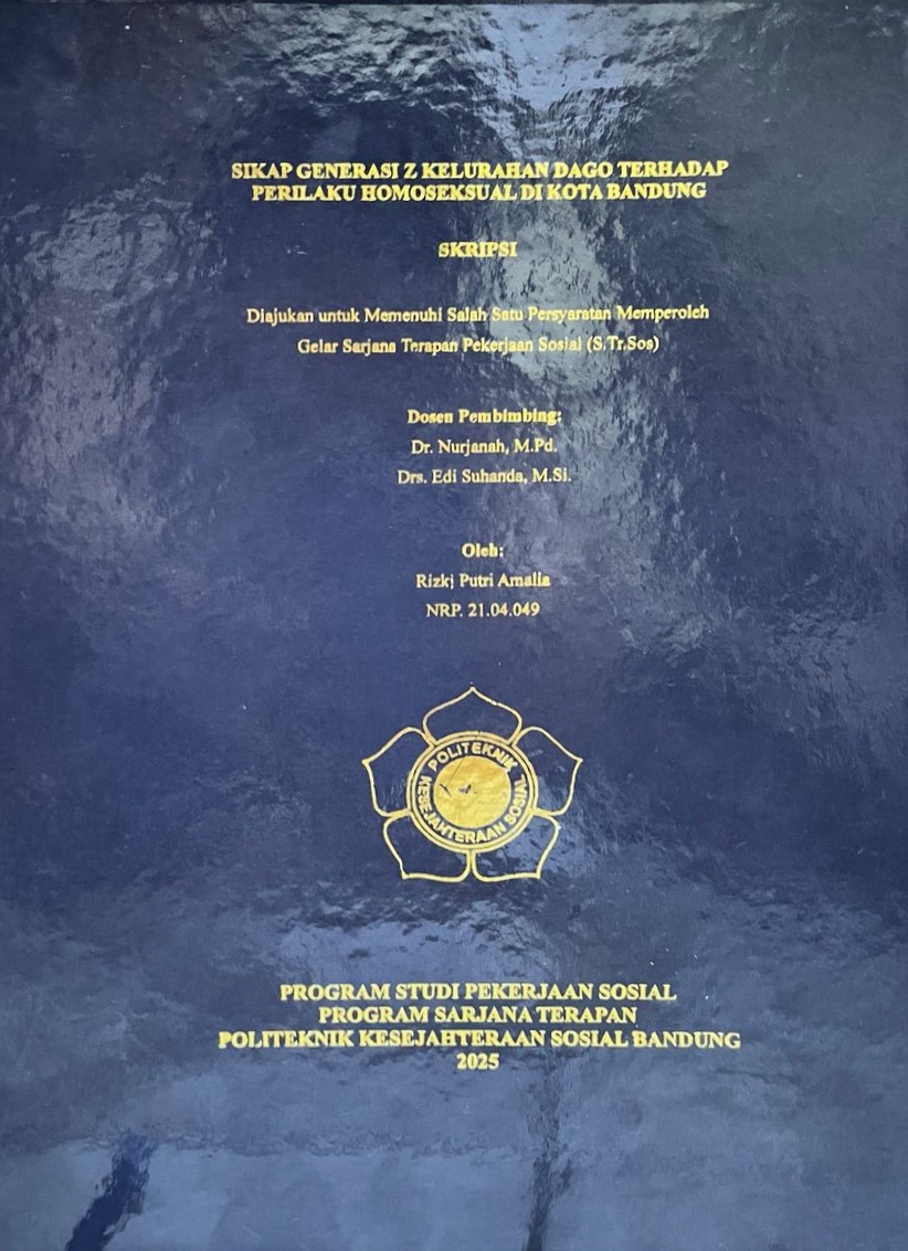 Rizki Putri Amalia, NRP. 21.04.049. Sikap Generasi Z Kelurahan Dago terhadap Perilaku Homoseksual di Kota Bandung. Dibimbing oleh NURJANAH dan EDI SUHANDA. Generasi Z merupakan kelompok usia terbesar dalam struktur demografi Indonesia, yaitu mencakup lebih dari 27% dari total populasi. Mereka memiliki peran penting dalam menentukan arah pembangunan bangsa. Salah satu tantangan yang dihadapi generasi ini adalah maraknya perilaku homoseksual di masyarakat. Kota Bandung menjadi salah satu kota dengan jumlah individu homoseksual tertinggi di Indonesia. Hal ini menimbulkan beragam sikap terutama di tengah masyarakat yang masih menjunjung tinggi nilai norma dan ajaran agama. Sikap merujuk pada pengetahuan atau keyakinan, perasaan emosional dan kecenderungan berperilaku dari suatu objek sikap. Penelitian ini bertujuan untuk memperoleh gambaran empiris tentang: 1) karakteristik responden, 2) kognitif/pengetahuan 3) afektif/perasaan dan 4) konatif/perilaku pada generasi Z terhadap perilaku homoseksual. Penelitian ini menggunakan pendekatan kuantitatif dengan metode deskriptif. Teknik pengambilan sampel yang digunakan yaitu Cluster Sampling dengan jumlah 183 responden. Teknik pengumpulan data yang digunakan yaitu: 1) kuesioner dan 2) studi dokumentasi. Uji validitas menggunakan construct validity dan pengujian reliabilitas menggunakan Alpha Cronbach dengan nilai 0.964. Hasil penelitian menunjukkan bahwa pada aspek kognitif (pengetahuan) memiliki skor 48,86% yang berada dalam kategori sedang, sementara itu pada aspek afektif (perasaan) memiliki skor 39,73% dan aspek konatif (perilaku) memiliki skor 34,15% dimana keduanya berada pada kategori rendah. Hasil rekapitulasi ketiga aspek berada pada kategori rendah dengan skor 40,91% dimana menunjukkan bahwa responden cenderung menolak dan tidak setuju terhadap perilaku homoseksual. Analisis masalah mengidentifikasi bahwa penolakan ini berpotensi memicu perbuatan perundungan atau bahkan kekerasan terhadap kelompok kaum minoritas. Program yang diusulkan pada penelitian ini adalah “Z Talks: Edukasi tentang LGBT di Kalangan Generasi Z”. Program ini menggunakan metode COCD dengan model locality development. Kata Kunci: Sikap, Generasi Z, Homoseksual