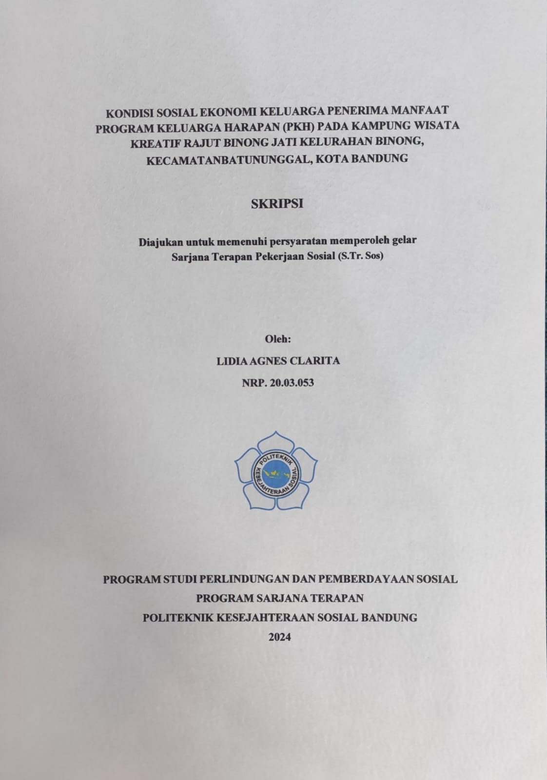 LIDIA AGNES CLARITA, 20.03.053. Socioeconomic Conditions of Beneficiary Program Keluarga Harapan (PKH) in Binong Jati Creative Knitting Tourism Village, Binong Village, Batununggal District, Bandung City.