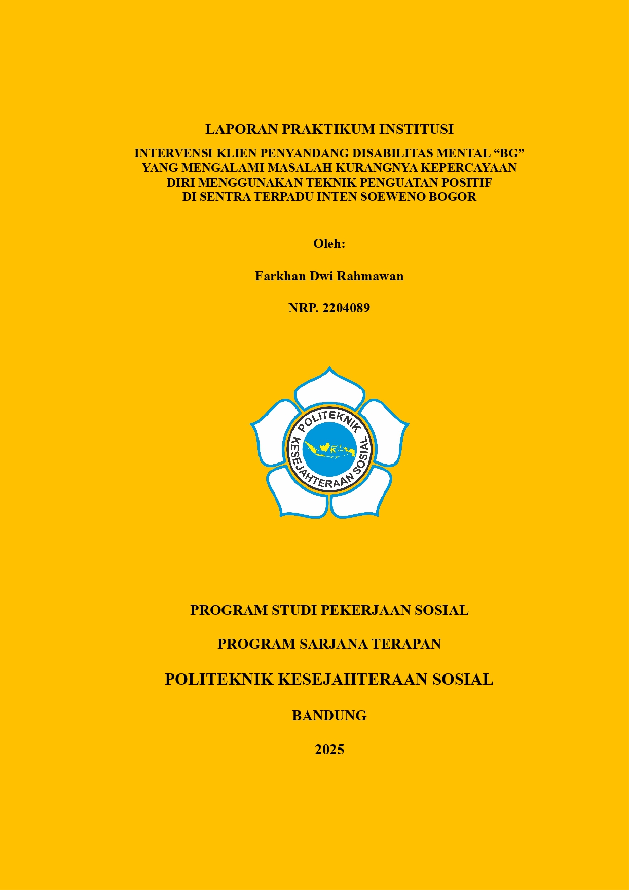 LAPORAN PRAKTIKUM INSTITUSI INTERVENSI KLIEN PENYANDANG DISABILITAS MENTAL “BG” YANG MENGALAMI MASALAH KURANGNYA KEPERCAYAAN DIRI MENGGUNAKAN TEKNIK PENGUATAN POSITIF DI SENTRA TERPADU INTEN SOEWENO BOGOR