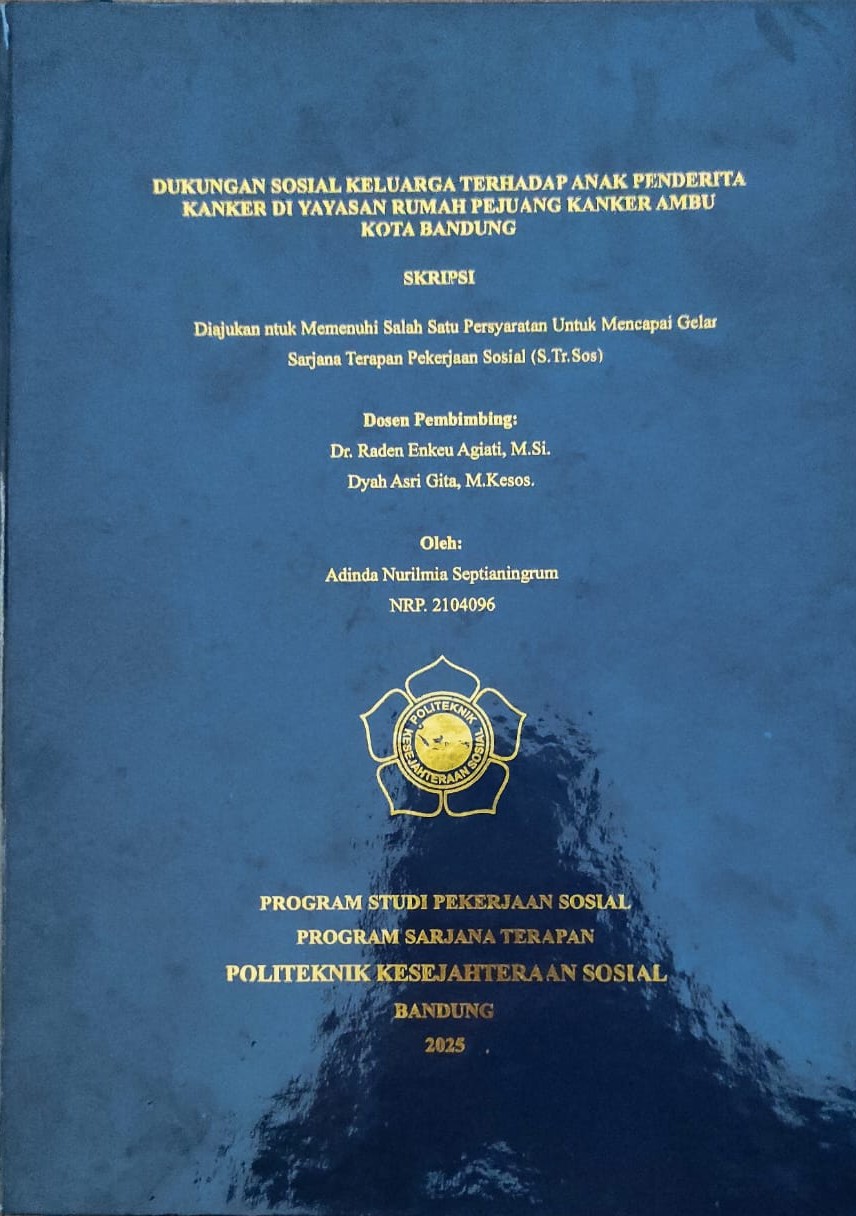 ADINDA NURLMIA SEPTIANINGRUM, NRP. 21.04.096. Dukungan Sosial Keluarga Terhadap Anak Penderita Kanker di Yayasan Rumah Pejuang Kanker Ambu Kota Bandung. Dosen Pembimbing: Raden Enkeu Agiati dan Dyah Asri Gita Pratiwi.